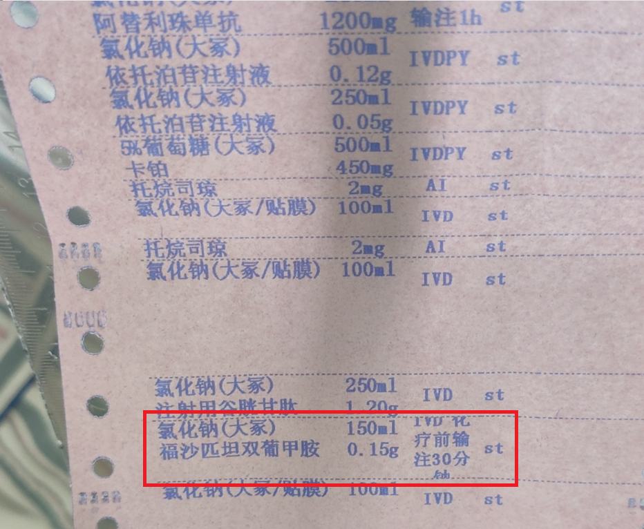 三化继续阿替利珠单抗联合EC化疗的方案。二化之后白细胞继续走低,中间打了一次短效生白针。然而在临近第三次化疗时,血小板断崖式下跌,10天时间从241跌到134再到59,打了3天白介素11,回升到67,医生说需要继续打,又打了两天回升到121,终于可以按时开始第三次化疗。7月20号开始三化,然而由于医院的福沙皮坦双葡甲胺缺药,医生也没告诉我们,直接就开始化疗,这个药物应该是化疗前第一个先输入用来防止呕吐恶心的。第二天我核对用药清单才发现,找医生说缺药所以没用,晕倒。然后给开了阿瑞匹坦口服补救,已经来不及了,第二天和第三天,以及回家后的2天,老爸恶心想吐的感觉非常难受,导致吃饭也没胃口,睡了几天才缓解过来。