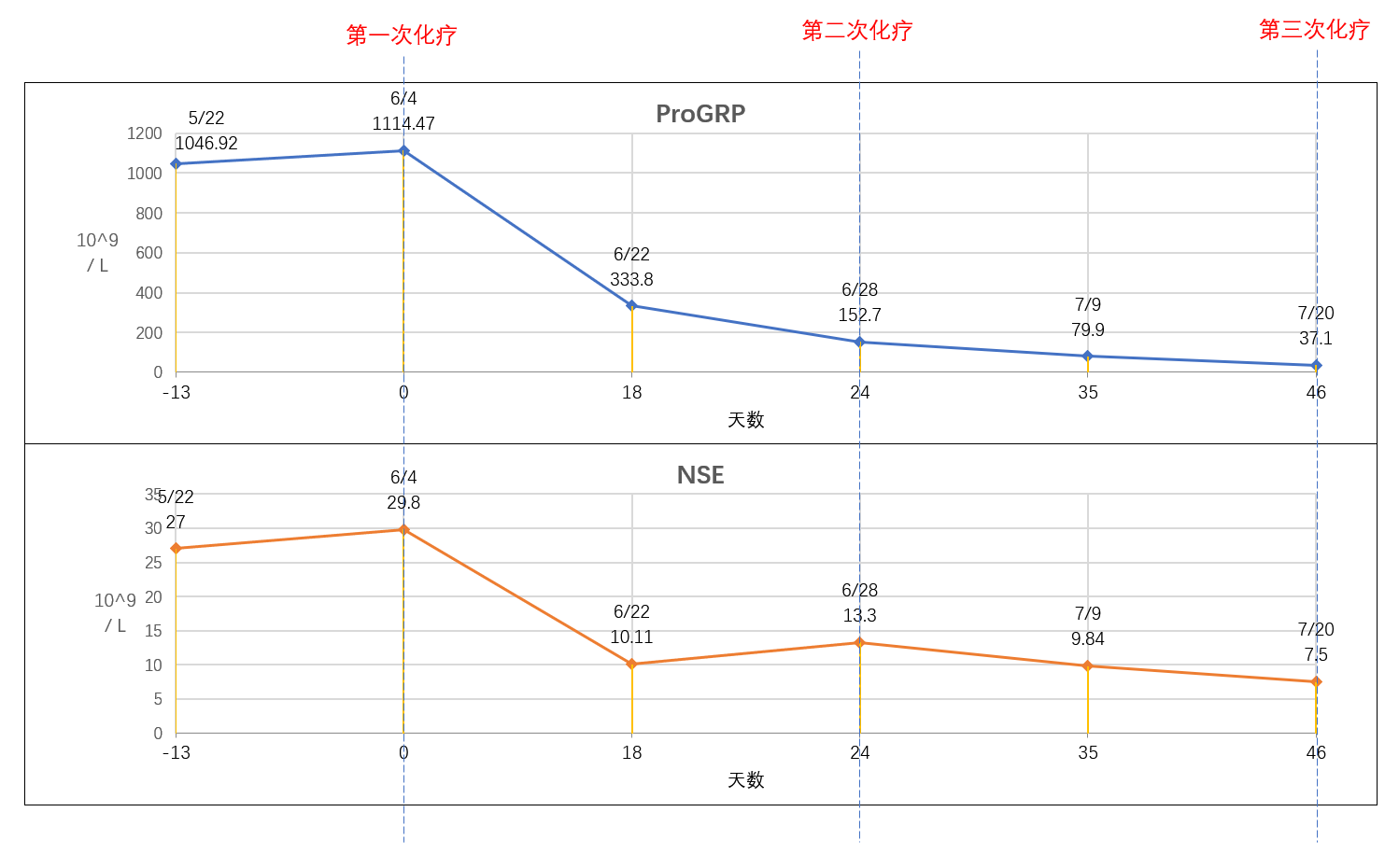 三化前肿瘤标志物持续下降,ProGRP一化之前最高点1114,两次化疗后持续走低,三化前回到正常区间37.1,NSE回到7.5