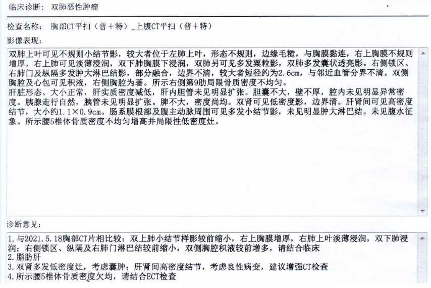 三化之前做了胸部CT平扫,检查结果显示肺部小结节缩小,之前肿大淋巴结也有缩小,但是右上胸膜增厚,同时有了肺侵润,胸部积水也有增多,但医生说不用管。总体感觉也没有期待的好,因为拿到了基因检测的结论,感觉大概率免疫治疗没有起效。体感倒是不错,除了化疗的副作用,生活基本正常。