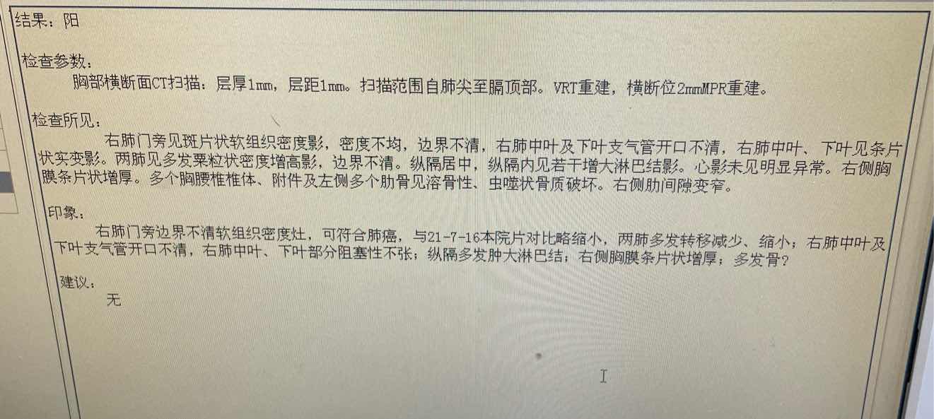 但是吃奥希替尼副作用真的很大,肝肾功能异常,心率异常,呕吐,腹泻,这些副作用我妈妈都遇上了…再加上病情进展,真的很伤脑筋,不得不入院观察,还记得刚入院那天D2指标40多,把我吓坏了。