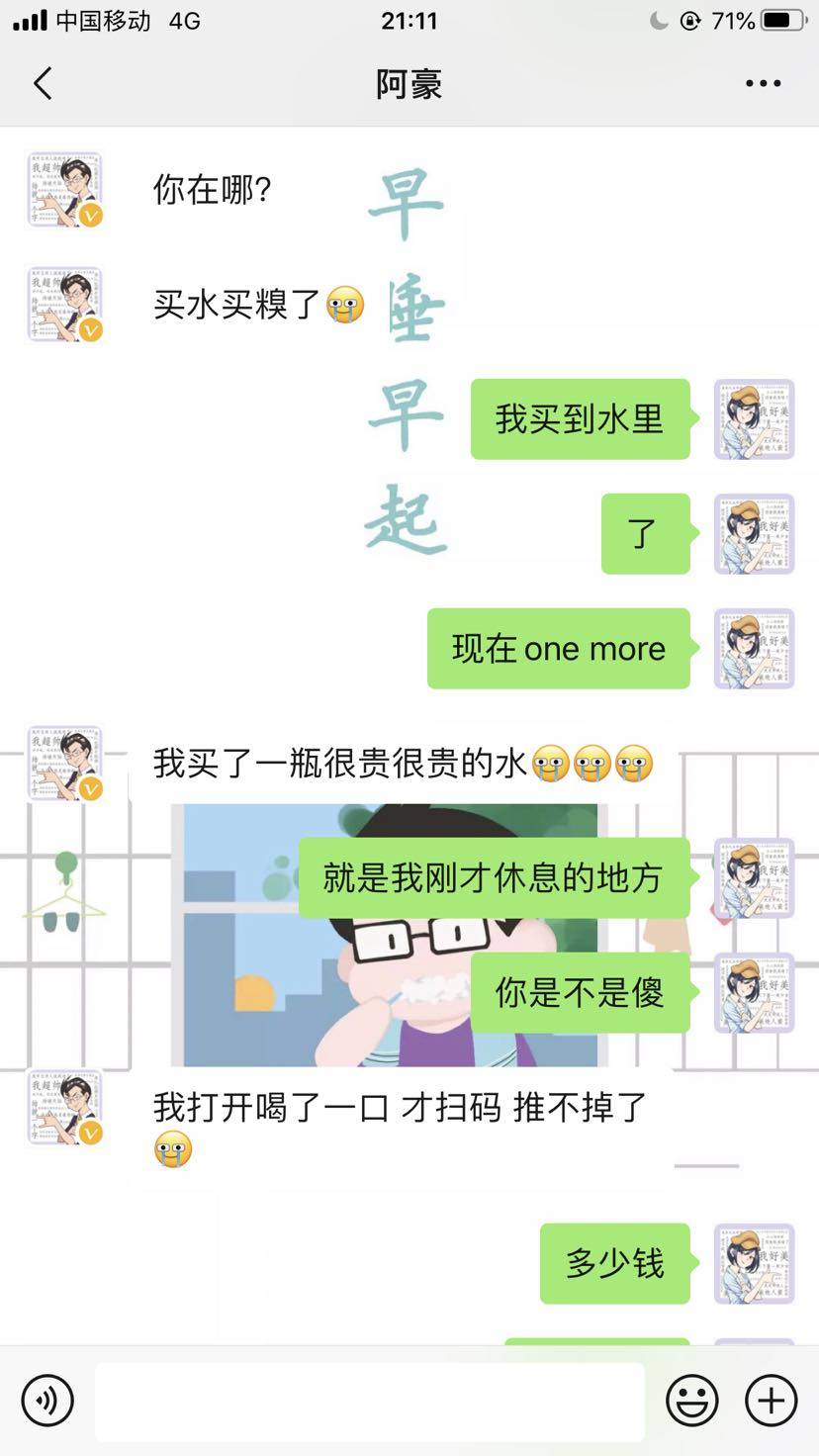 二、吃完午饭去天鹅湖万达遛遛,也算消食了,逛了两个多小时之后感觉口渴他去买水,在三楼餐饮转了半天,迟迟不见他买水回来,实在渴得难受我也上楼在一家饭店买了一瓶三块的怡宝,感觉买贵了,不过也解了燃眉之急。过了一会手机上传来他的消息,他说他买了一瓶贵的矿泉水,具体以截图为算。最后见面,我尝了一口,确实值这个价,喝一口就能成仙。(实际是为了寒蝉他)他说他在影城买的,服务员拿给他就开了尝一口,当时付钱的时候才知道这么贵,他说真有想扇自己脸的冲动。