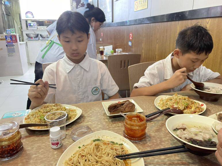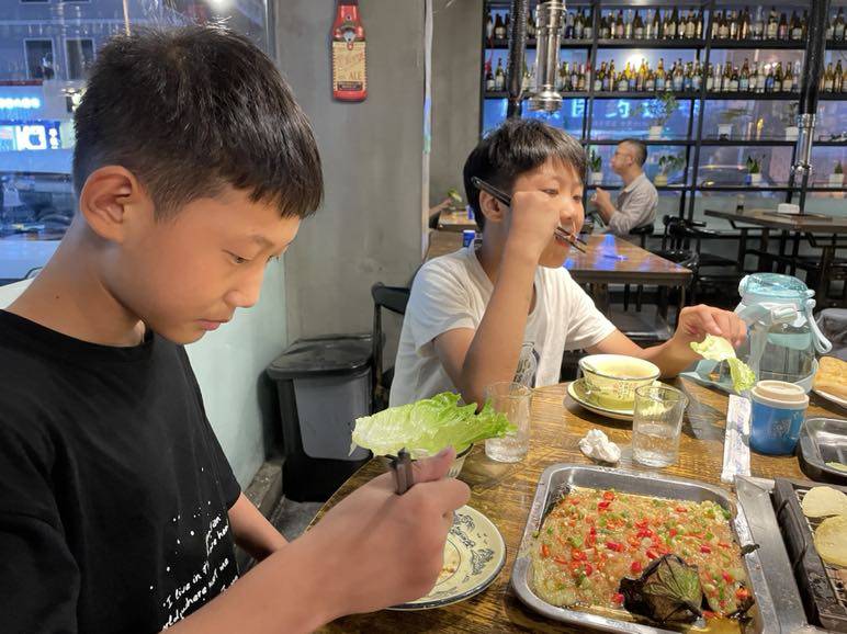 孩子单亲家庭长大,有点拘谨,问啥也不回应。只好我们直接做主点了,牛肉,猪肉,炒饭。两孩子一声不吭的吃。。慢慢活跃一点了,回应了两句。。吃完回家的路上,孩子打打闹闹,我怕车撞上他们,追着喊,一眼不敢错过。