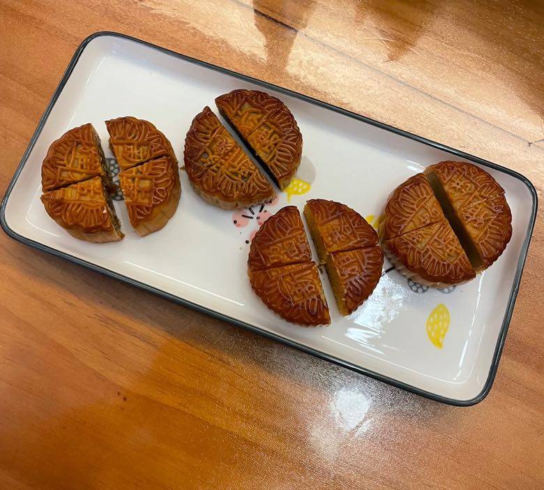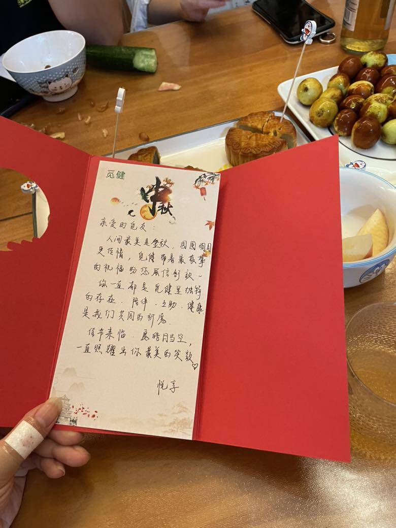 吃完饭,上了水果和月饼。今年月饼是觅健送的,大赞,有圈主亲手书写的小卡片,很温馨。开箱了,才发现,哇咧咧,太贴心了,月饼是低糖的。