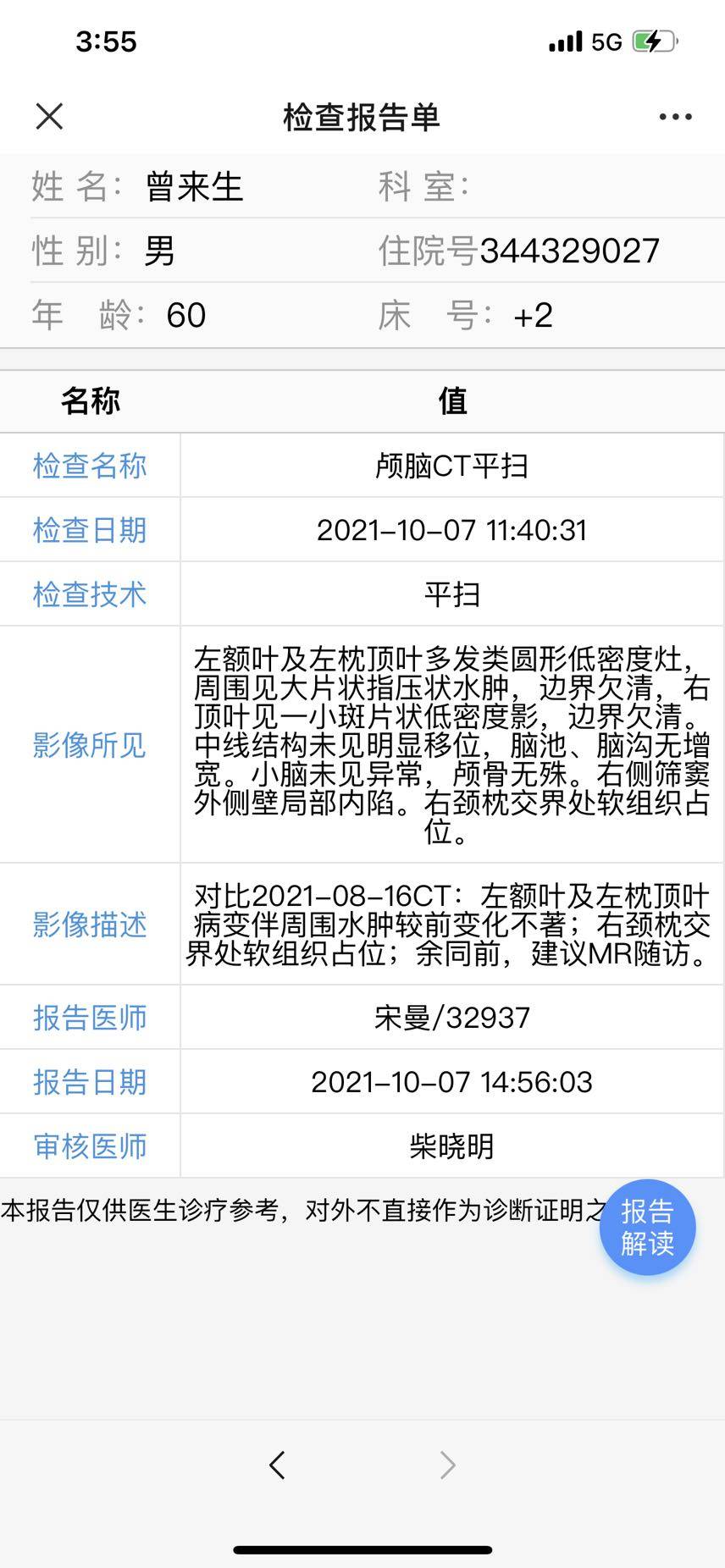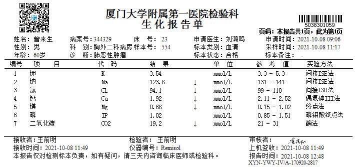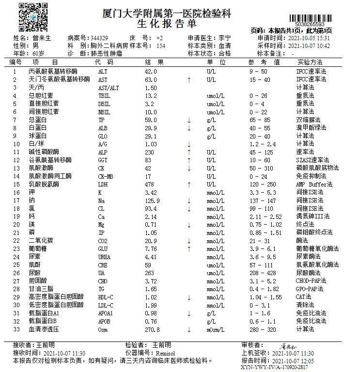 大家好,家父经历上次脑转并且水肿后,用了2021年2月全脑放疗,春节前结束,并且继续甘露醇点滴,春节后复查发现水肿依旧很严重并没有减少,进行了次贝伐单抗5支,水肿颅内高压紧急情况下盲试了9291(奥希替尼),一周后复查,水肿带消失,剩下一点。脑转囊性瘤缩小。于是继续吃盲试的9291,1个月骨转疼痛加剧,但是骨扫描,核磁共振等显示骨转并未进展。原本放疗过的髂骨疼痛难忍,开始奥斯康定止痛,1个月后再➕点滴凯芬止痛勉强缓解疼痛。并担心9291靶向无效并且引起肌肉神经痛,于是换了一个月的阿美替尼,症状并未缓解,疼痛加剧,于是8月再次用培美曲塞➕奈达铂➕pd1化疗一次。8月中因为骨髓抑制严重,血小板一度到6,白细胞太低入院抢救一周。血小板回升正常值,白细胞正常值。但是体感越来越差,这周因头疼,长期卧床,不爱吃,疼痛,意识错乱,恍惚再次入院复查,ct显示如下,因病人体感体质差只给予基础性营养调节,输白蛋白治疗,恳请大家给予意见[抱拳],面临胸腔积液,疑似肝转的症状,有什么好的办法可以应对[抱拳],并且有严重低钠,补钠今天第三天,数值依旧没上来,连续两晚整晚没睡觉,睁着眼睛一直转,嘴里不停唠叨,今天意识不清醒,说话含糊。