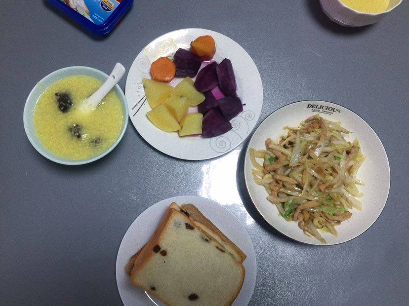 简单的早餐:早餐小米海参粥,红薯土豆紫薯一锅蒸,白菜肉丝,全麦吐司加奶酪