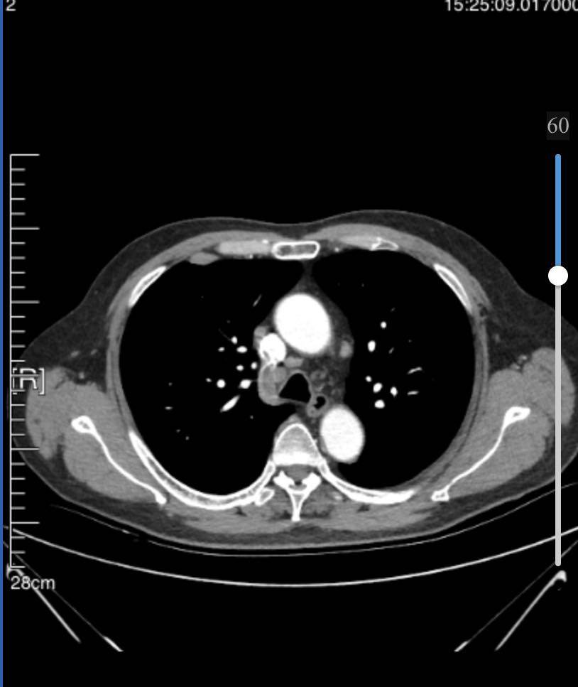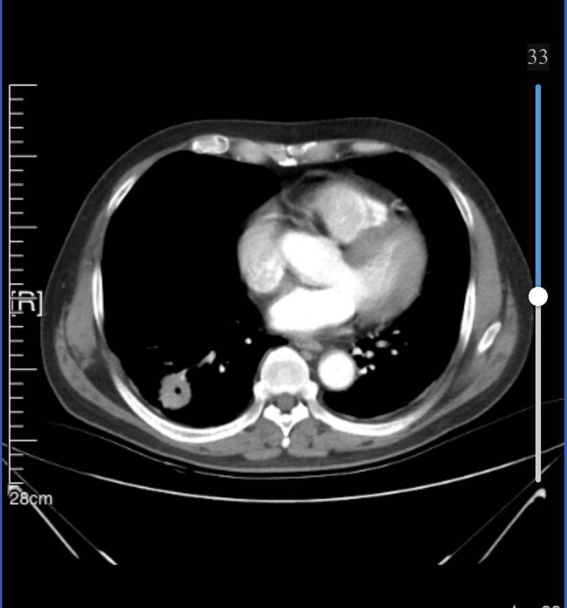8月21日胸ct显示右肺下叶占位,3.4cm*3.0cm,纵隔及右肺门多发增大淋巴结;右前肋胸膜外脂肪间隙内淋巴结肿大;左肺上叶磨玻璃结节1.6cm,微浸润性腺ca。
