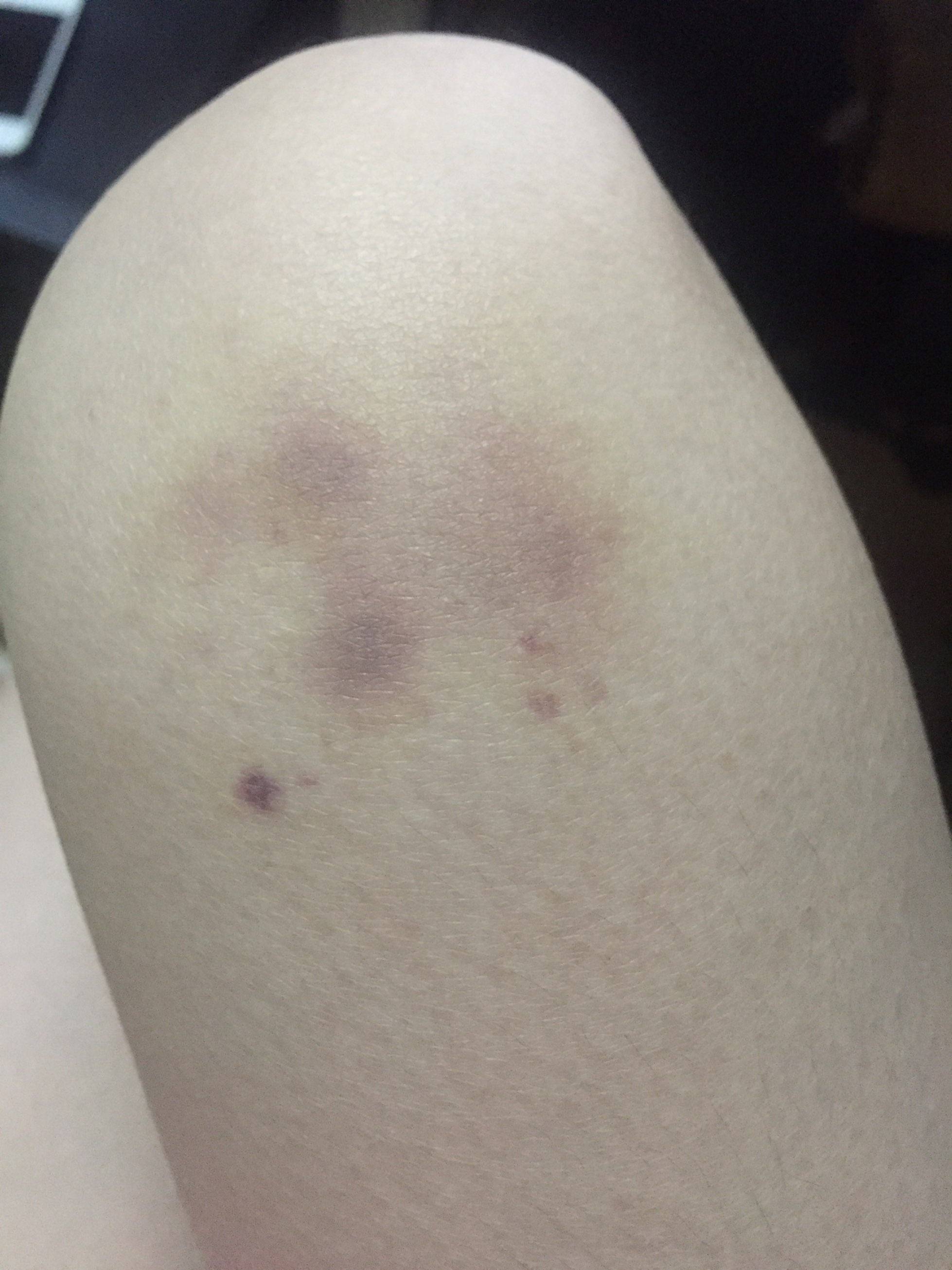 我的腿经常这样,一不小心碰到哪里就会这样子我都不管它,过几天自己就好啦,我们吃激素就会这样