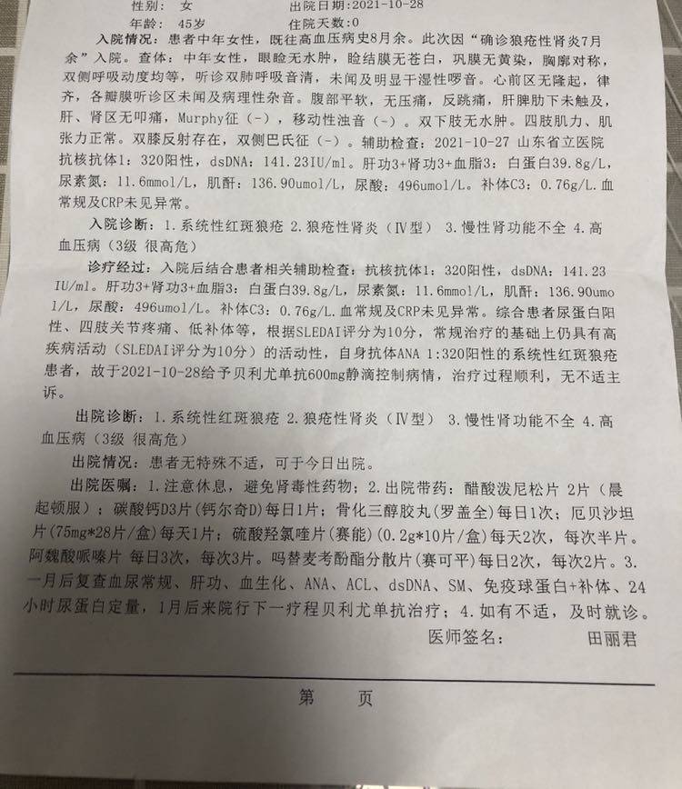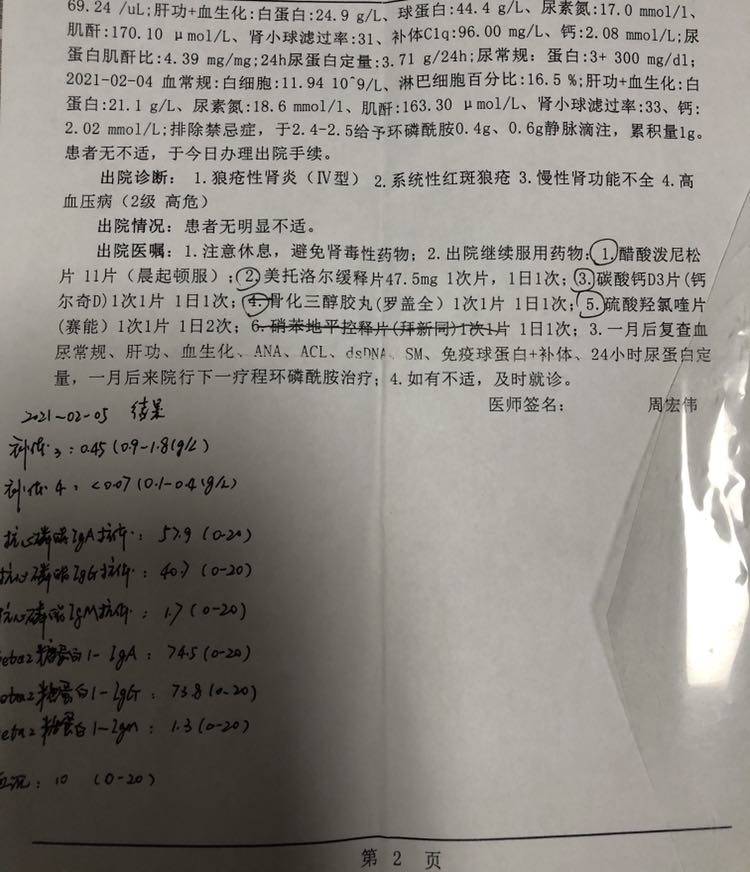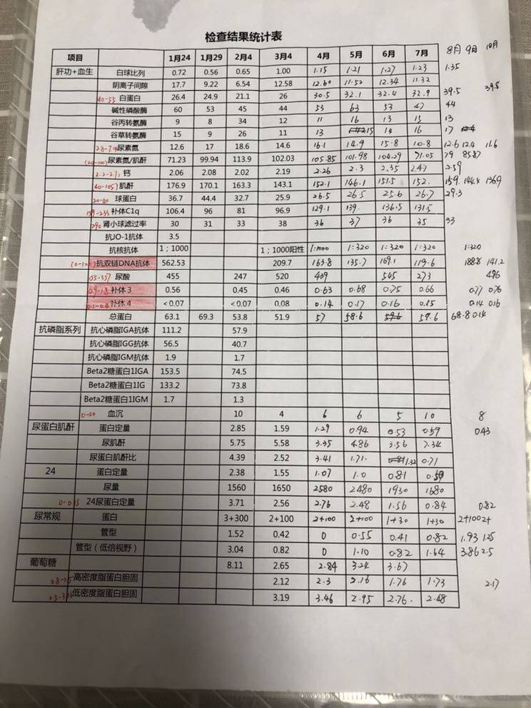 目前环磷酰胺累积量6克,因胃肠道反应较大,脱发,经医生同意改为口服吗替0.5gBid。因为抗双链dna一直不理想医生建议开始用贝利优单抗,激素减至1.5片,纷乐两片早晚各一,另外还有常规钙片+骨化三醇。阿魏酸哌嗪片和百令胶囊偶尔吃,并没有完全遵医嘱。