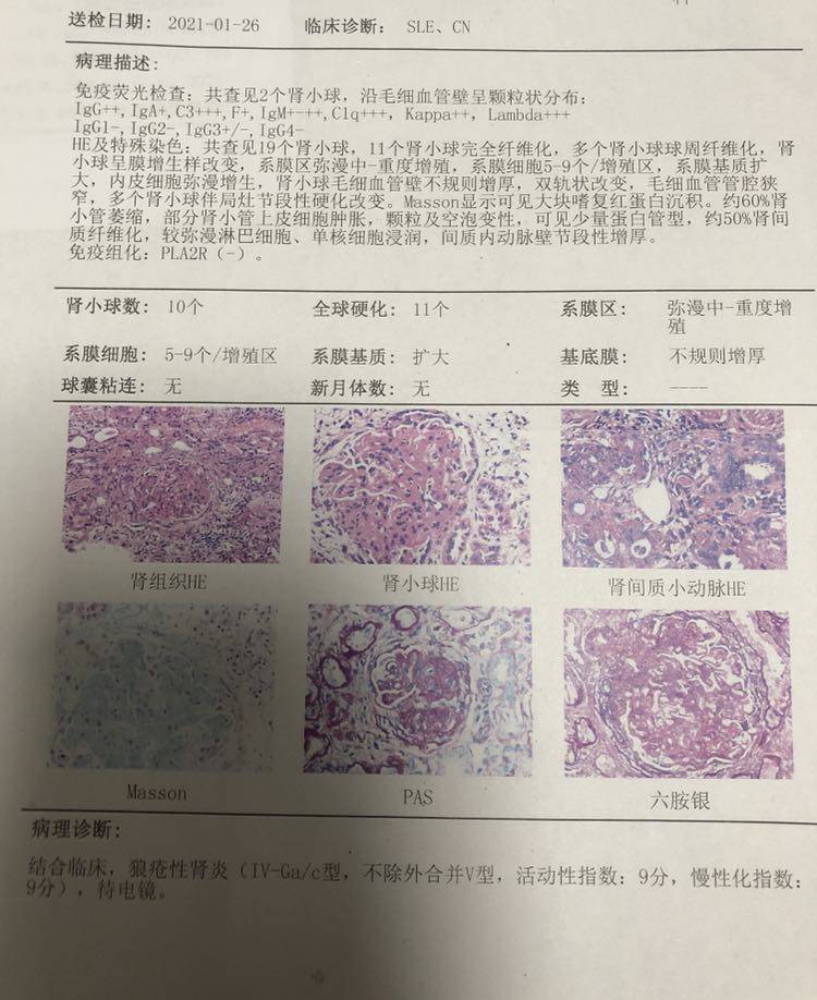 再来谈谈治疗:首次入院肾穿4+5型。强的松500mg冲击3天,丙球静滴12.5g连用3天;环磷酰胺1g连用六个月,口服泼尼松12片/羟氯喹0.4Bid,拜新同降血压,非布司他控制尿酸。复视缓解,血压正常,病情稳定,出院。