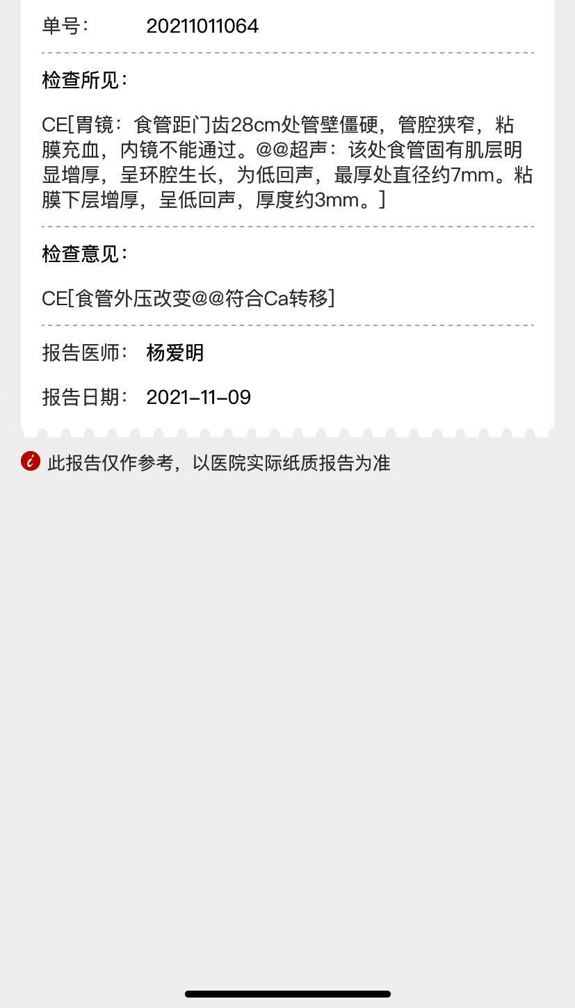 昨天的胃镜检查,应该是比较痛苦的,但我坚持下来了,为了查病,值得!他人做胃镜检查需要通过探头来观察食管和胃部内部疾病和进展,10几分钟就结束,而我却是因为外部挤压到食管中下部28cm,导致食管内部狭窄,食物吞咽困难,影响到消化器官正常工作,所以在检查时随着肿瘤增长,镜子根本就通不过。我在检查过程中,虽说没有痛感,但堵塞哽咽感强烈,口水眼泪鼻涕三管齐下,幸运的是今天检查遇到主任,听到主任很确定我的情况完全符合Ca转移,下一步就是需要做放化疗。