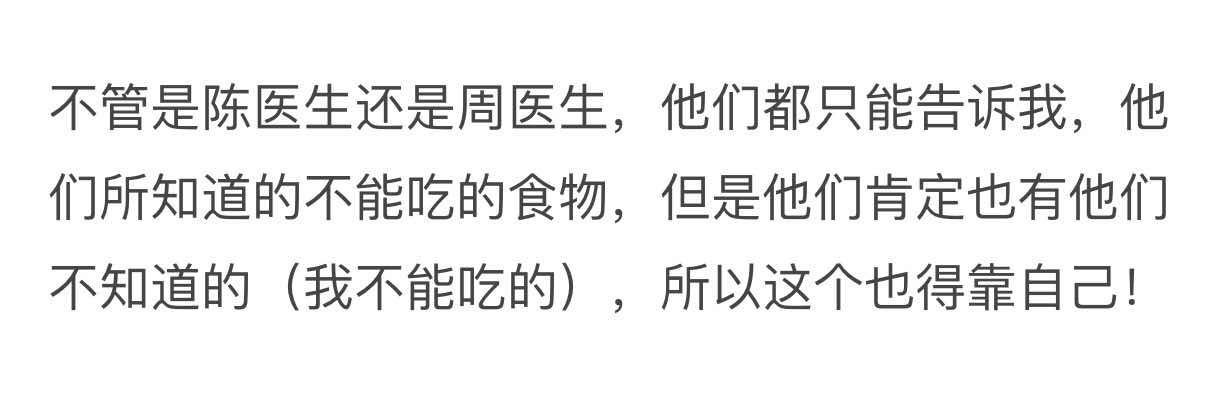 这是某个帖子的截图。深有同感,对于医生的嘱咐,理解很到位!想起我的中医说的:你不要问我你能吃什么,你应该问我你能吃什么,因为能吃的很少,不能吃的很多!