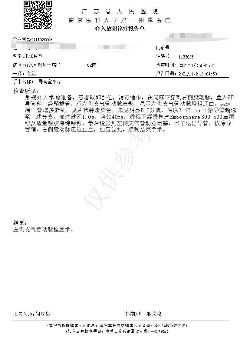 介入医生说由于此手术对身体损伤小,后期如果发现无法一次性治愈,可再次启动该方案,除此手术外,我们正常白紫+o+安罗联合治疗中