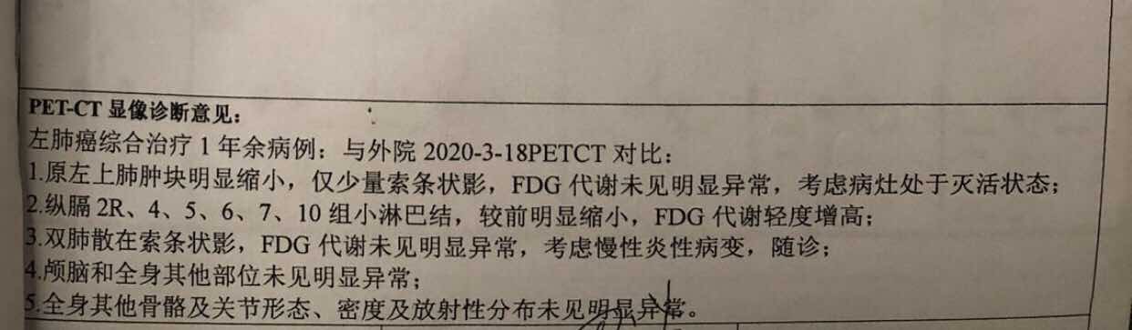 我的想法是,我家原发病灶近一年都没有变化了,但是CT上一直有5CM的截面,很大。如果是有活性的,这个就是个定时炸弹,为其他转移输送弹药;但一年都没有变化,我怀疑没有活性了。这些信息,CT报告并不会告诉你,在我们医院,甚至连尺寸都不是每次都写。有了这个想法后我就撺掇我姐带我妈去市医院做PET,我姐担心结果不好,影响心情。我觉得只有疗效才影响病人心情,有问题尽早发现不好吗?