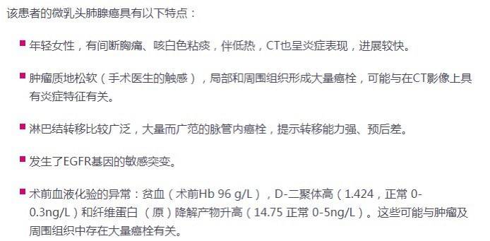 病理很快出来了,只做了镜下病理分析,没有做那些加加减减的免疫组化(县医院没有那个试剂),看到了以微乳头为主的腺癌细胞,可以说是腺癌细胞里最差的亚型。为什么要做病理,因为进展的时候有可能转小、转鳞,虽然概率不高,但是仍需要排除,如果转小转鳞了,靶向药效果肯定不太好,再者化疗方案也会完全不同,所以非常有必要。这次病理虽然仍是腺癌,但是告诉了我们是以微乳头为主这个重要信息,我们确诊时病理并没有写这个。经查询了解到,微乳头预后很不好,它的形态决定了它特别容易浸润淋巴,所以进展时容易有癌性淋巴管炎,会呈现炎症一样的影像,而且会形成大量癌栓,所以与血栓、凝血有关的指标也会在进展时显示异常,如D2聚体、纤维蛋白原降解产物等。我妈妈确实如此,这对以后判断进展还是炎症具有重要意义,我把这些查询结果发给了我妈妈的主治医生。