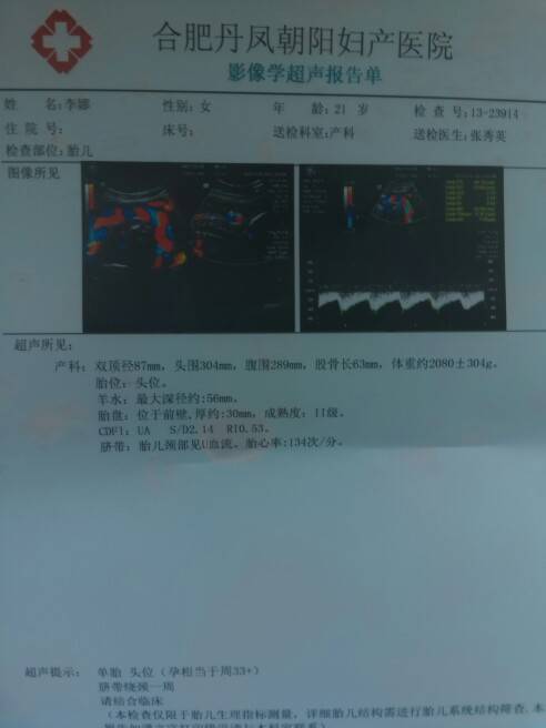 今天33周了,去检查,结果还不错,一直胎位不正,今天胎位居然正了,小孩已经头朝下了,但是脐带绕颈一周,