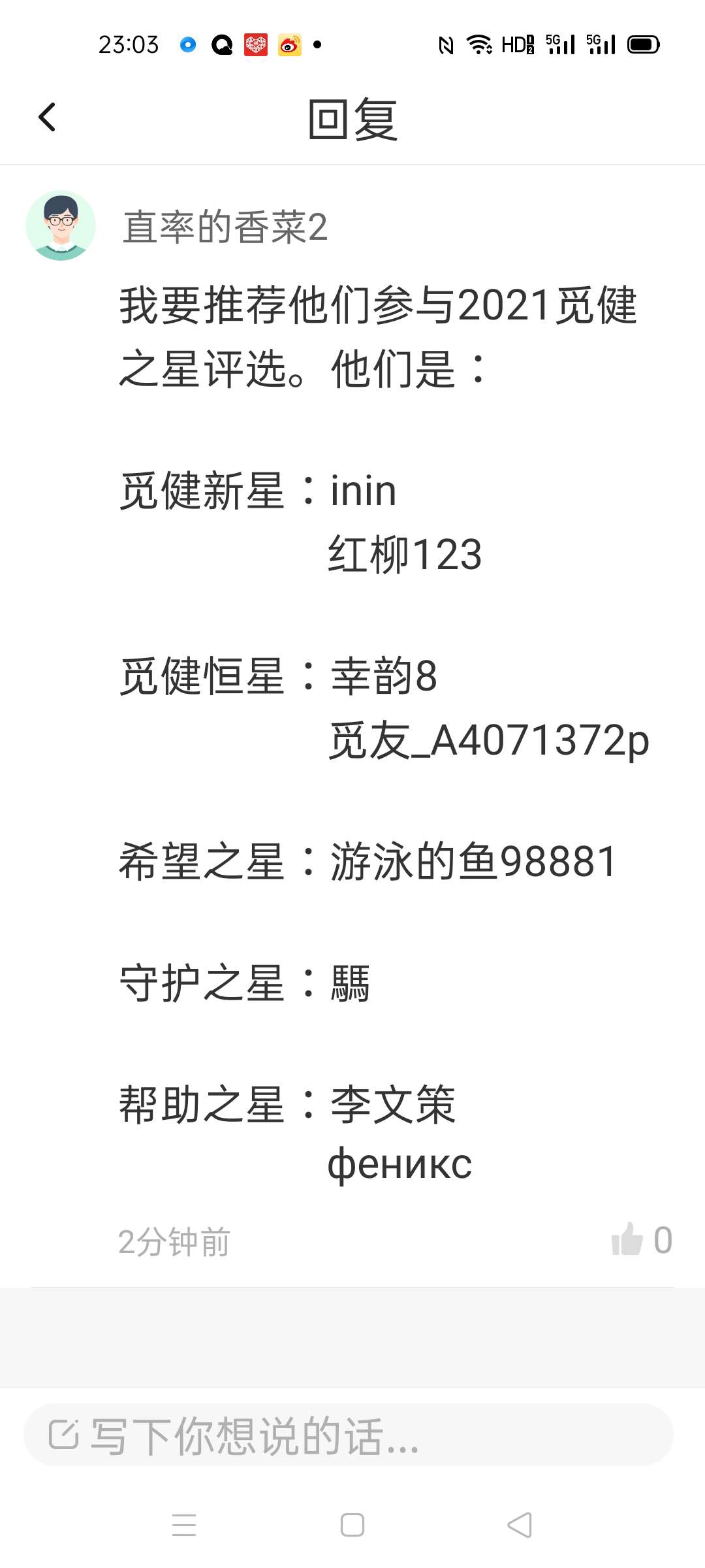 直率的香菜2我要推荐他们参与2021觅健之星评选。他们是: 觅健新星:inin, 红柳123 ;觅健恒星:幸韵8 ,觅友_A4071372p ;希望之星:游泳的鱼98881 ;守护之星:騳 ;帮助之星:李文策 ,феникс