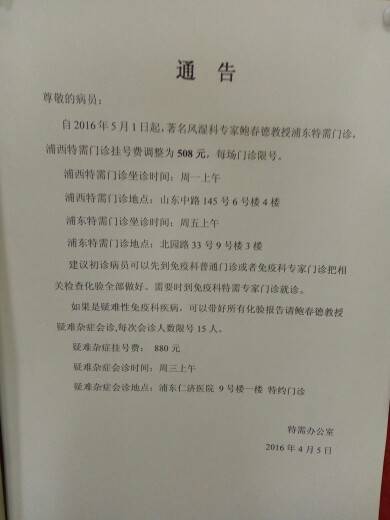 今天来仁济复诊,看见这样一个通知:鲍春德挂号费涨到508元了。哇,真是贵啊。之前268还算能接受。不过涨价了,号还是难挂,我挂了王元的。在等着,希望有减药的好消息。