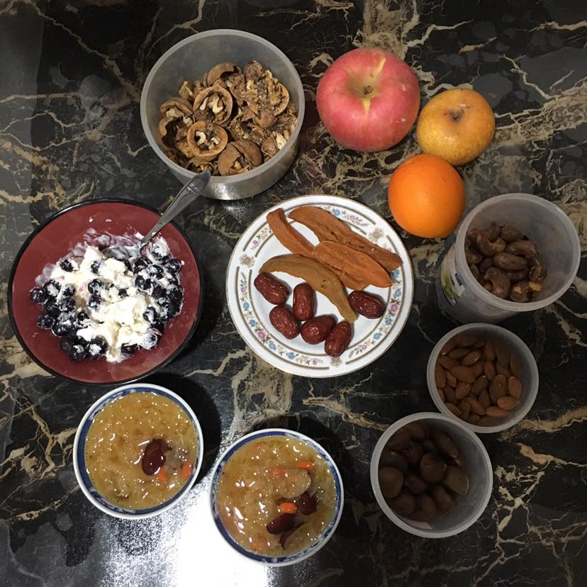 晚餐:自制无糖脱脂酸奶拌蓝莓 银耳羹 地瓜干 板栗 杏仁等