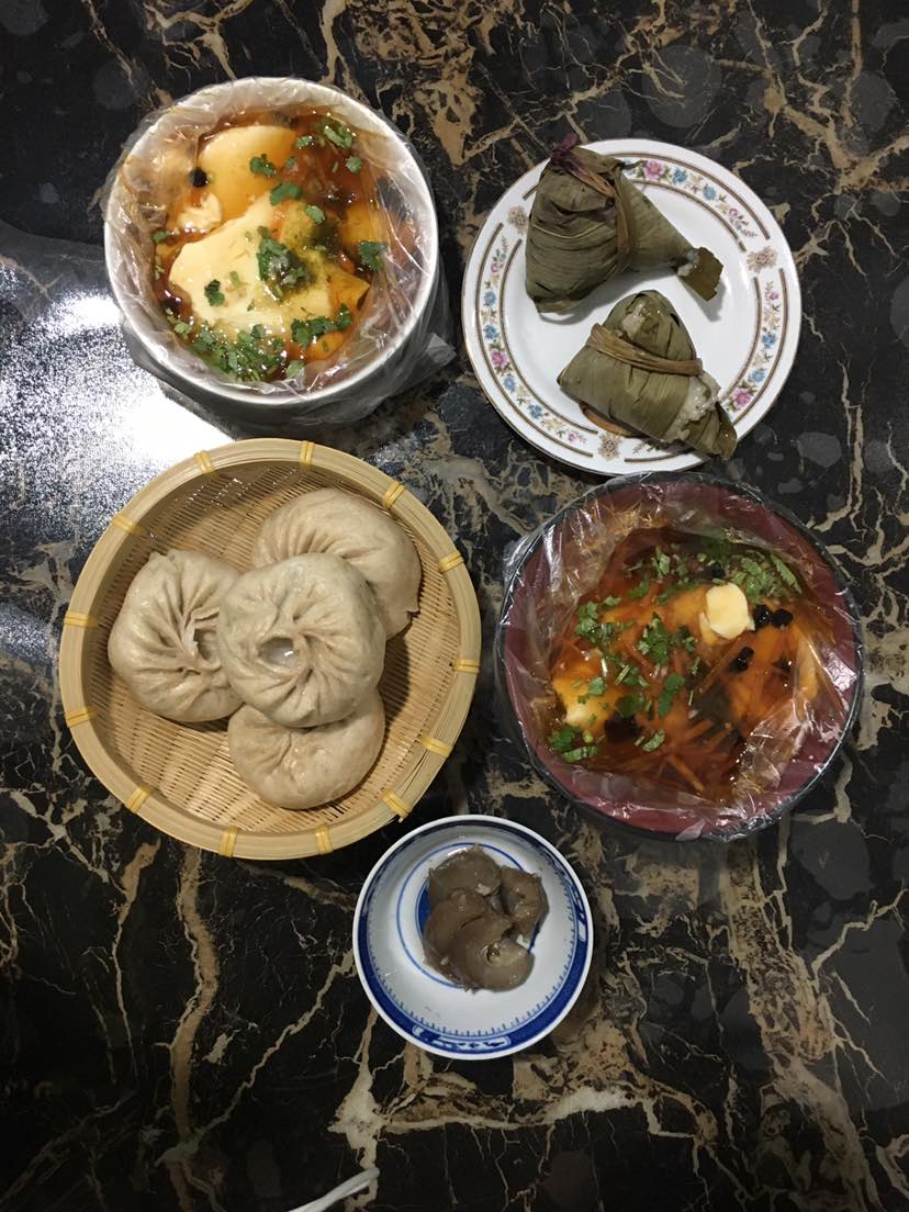 8号早餐:杂面萝卜雪虾包子和粽子,豆腐 脑 。