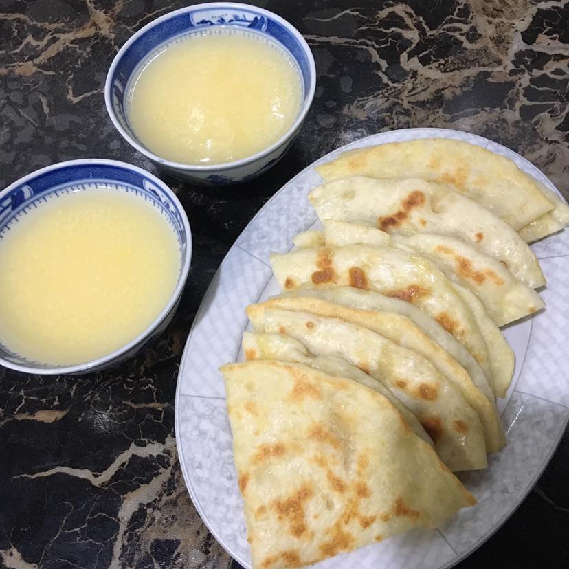 6号早上没吃早餐,和午餐一块吃。煮玉米碴子粥和烙饼。