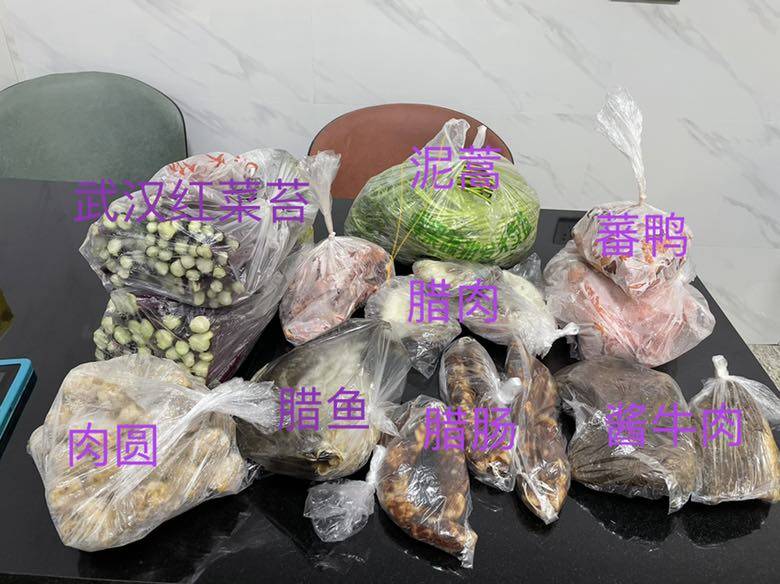 妈妈说腊肠和肉圆子是大姨自己做的,听说要给我寄快递,赶忙送来的……