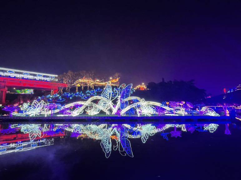 个人最喜欢的是把小朋友们绘画做成彩灯,对孩子的鼓励不言而喻,说不定未来的大师就出自这些小朋友。别忘记沿着河边栈道走(我们先就忽略走过了,再倒回去走栈道),除了美丽的化蝶灯组,各种彩灯美丽的倒影交相辉映也让人沉醉。