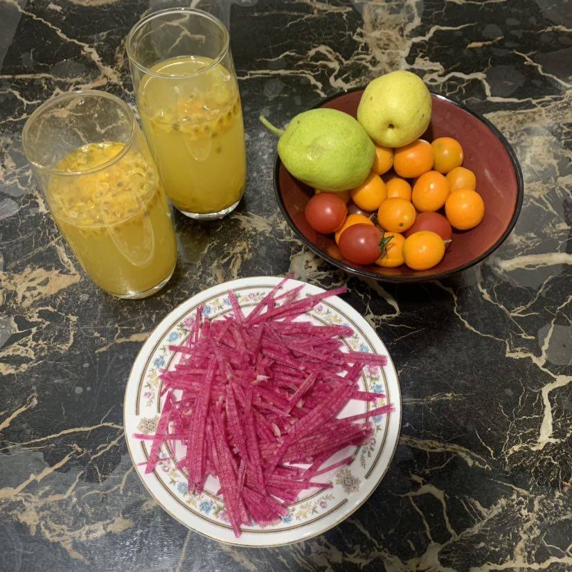 早餐:拌紫萝卜,也叫:心里美萝卜。一人一杯百香果水代替饮料🥤