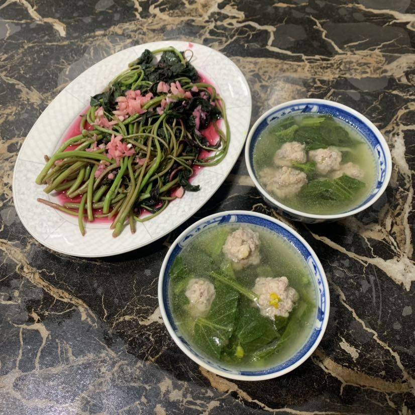 水炒红苋菜和肉丸菜心汤