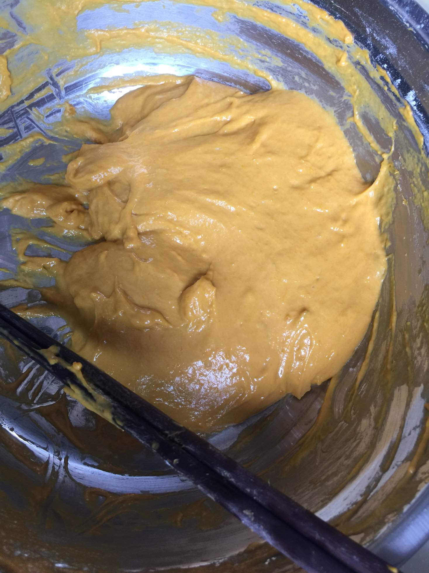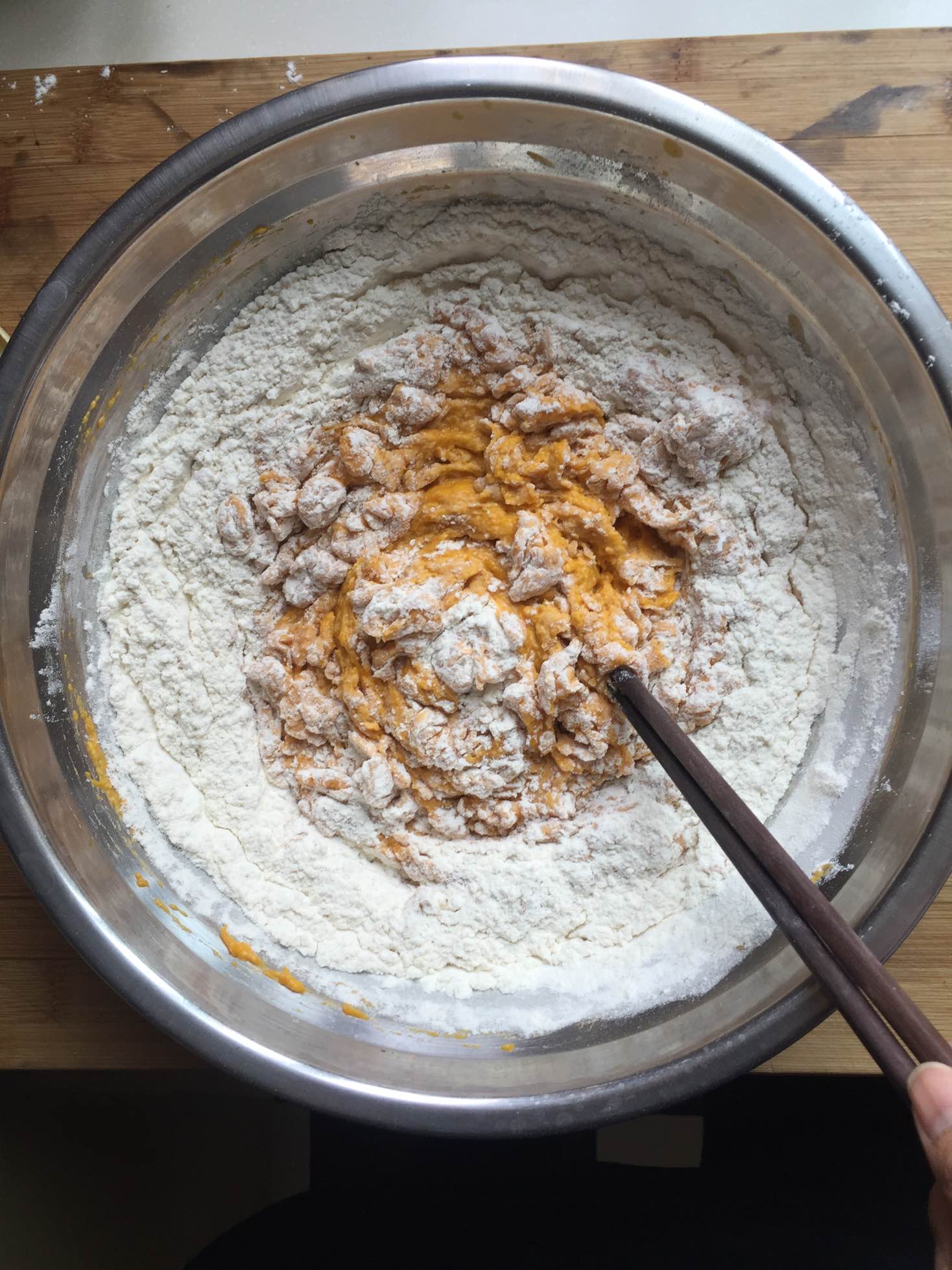 4、晾凉至30度左右,1:1放入面粉,也可以放糯米粉,搅拌均匀