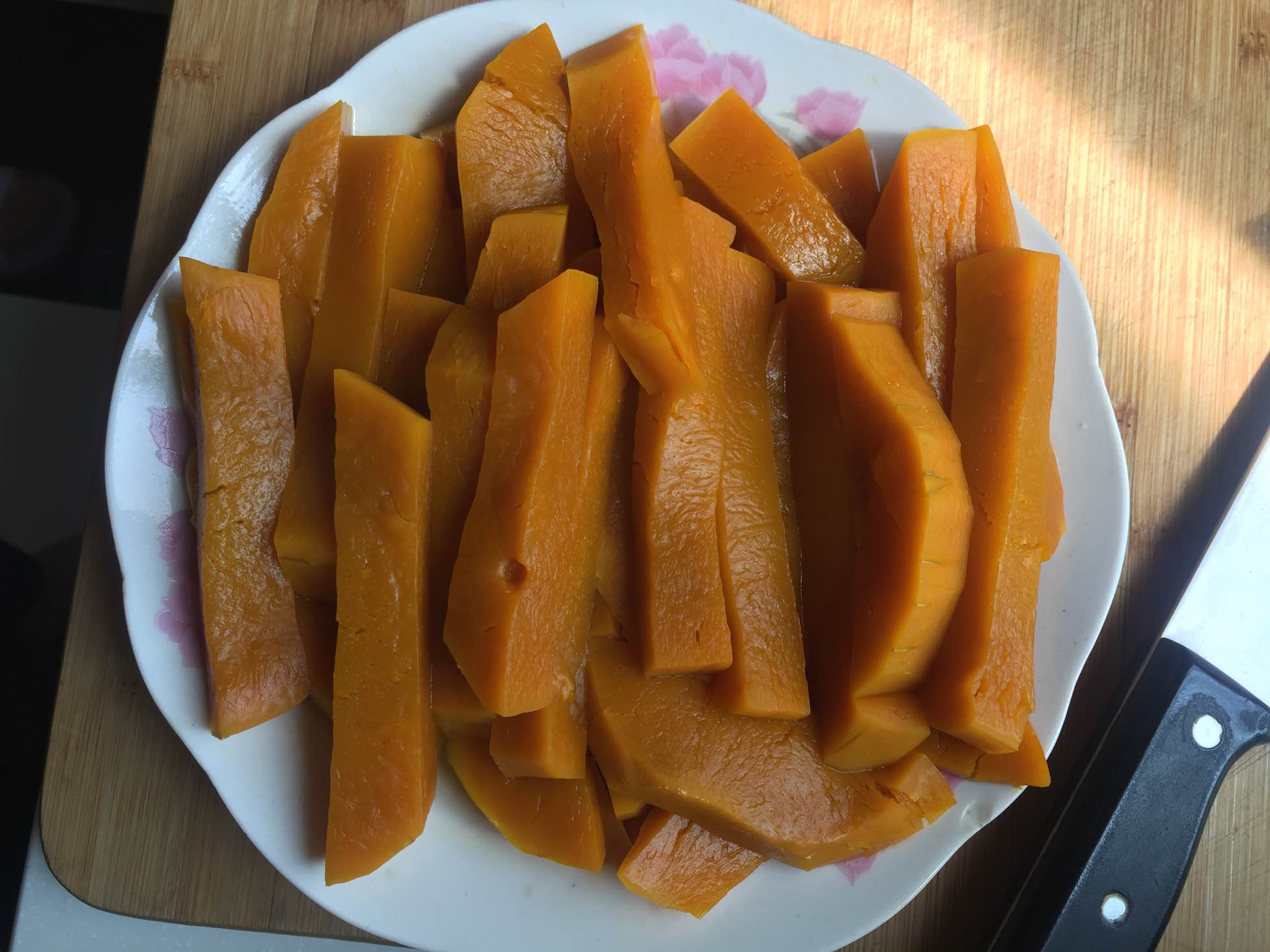 1、选购新鲜南瓜一块,去皮、洗净、切块