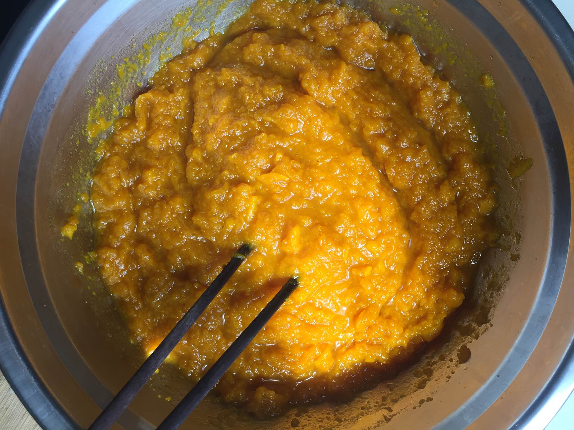 3、把熟南瓜块放入盆中,趁热放糖,多少随口味调整