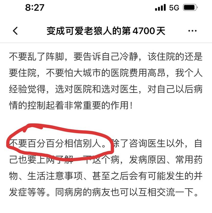 不要百分百分相信别人。除了咨询医生以外,自己也要上网了解一下这个病,发病原因、常用药物、生活注意事项、甚至之后会有可能发生的并发症等等。同病房的病友也可以互相交流一下。