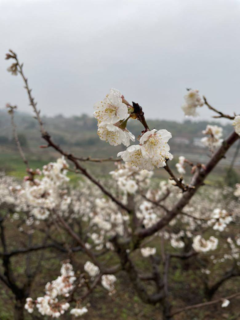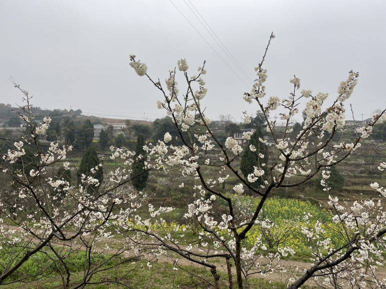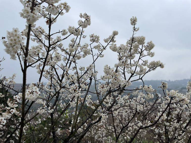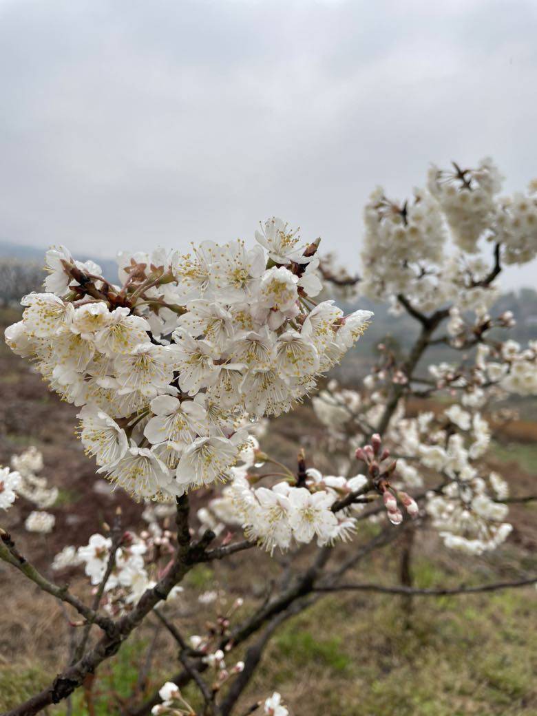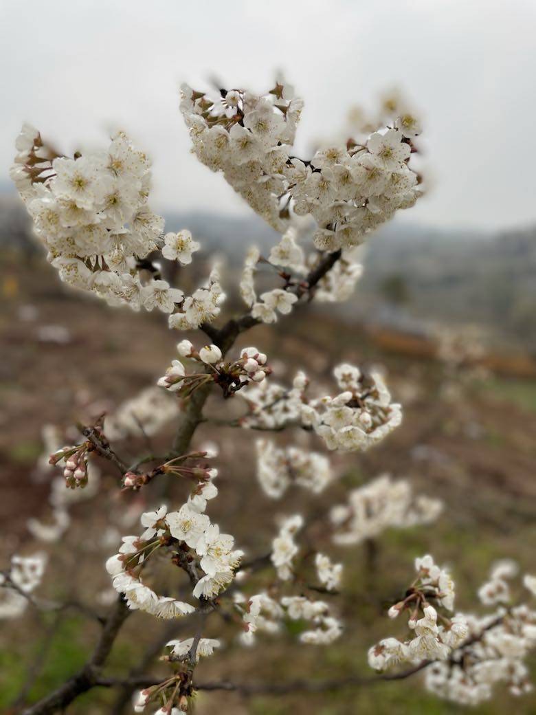 回来路上想到上周去看的樱桃花没开放,这周应该开了吧,毕竟已经比去年的花期整整晚了二十天了。于是转了一个弯跑去看樱桃花,果然漫山遍野的千树万树樱桃花开朵朵。在这两天雨水的滋润中舒展明媚,一饱眼福。再等一两个月又能饱口福啦。