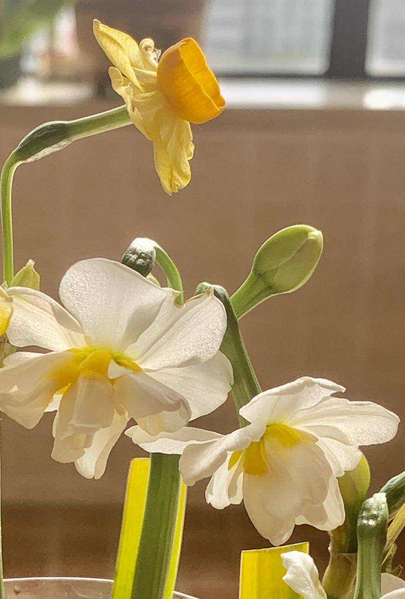 今年的水仙花只能这样了,太冷了,没有养好。昨天太阳出来今天立马芳香四溢。多辩和黄金二个。