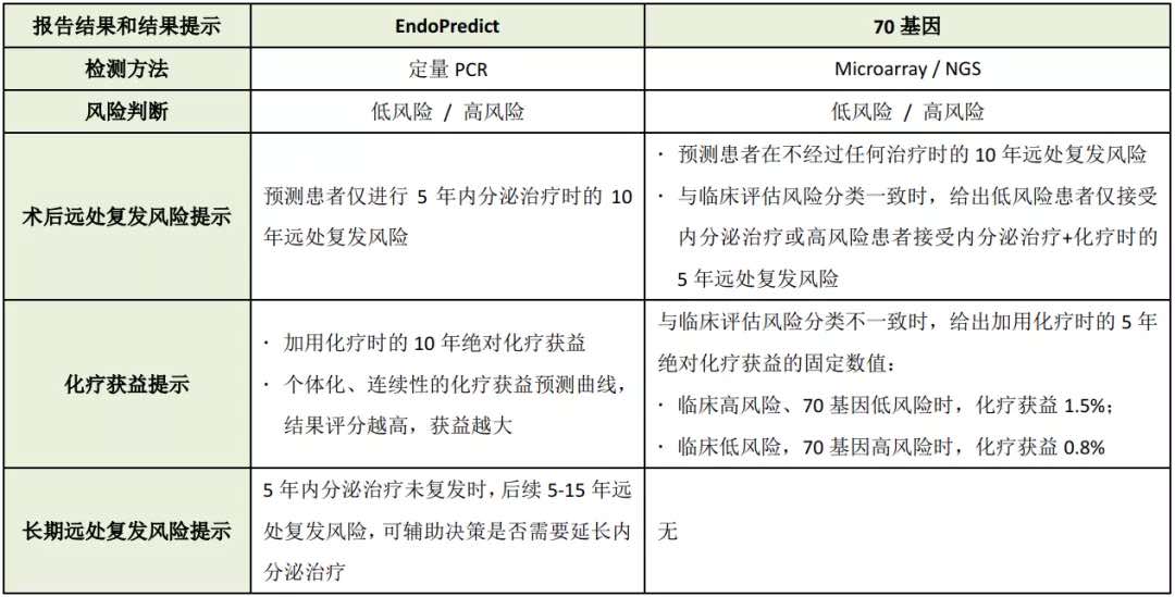 EndoPredict和70基因的检测方法和报告结果均存在较大差异,EndoPredict采用定量PCR方法,为患者定制个体化检测结果和提示信息。70基因检测方法为基因芯片法(Microarray,而后继续开发了NGS检测方法),检测结果需要和临床因素进行比对分析,以给出结果提示信息,详细对比如下表: