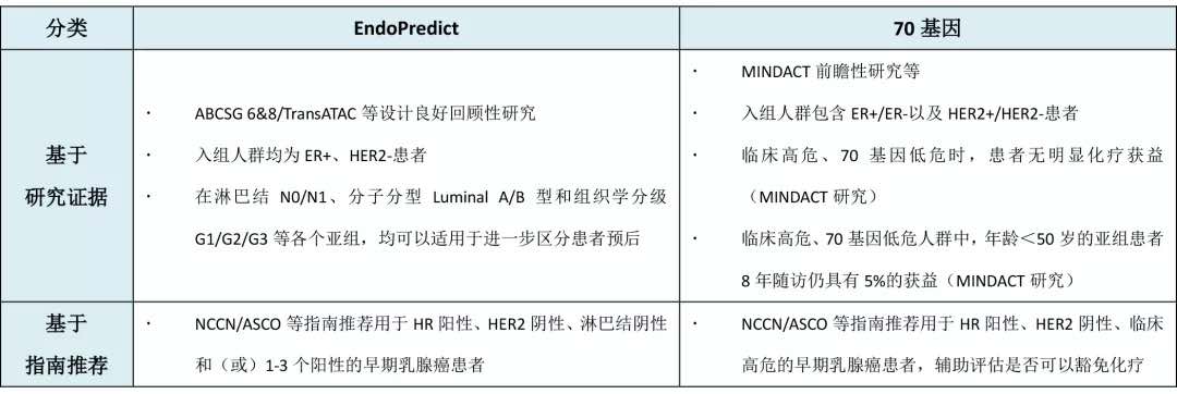 基于上述分析,EndoPredict与70基因的评分模型、适用人群与检测结果信息均存在差异,70基因以MINDACT研究为主要证据,主要针对临床高危、≥50岁患者,给出是否可以豁免化疗的建议,而EndoPredict将临床因素与多基因评分结合,考虑应用于淋巴结阴性和(或)1-3个阳性患者,提供10-15年更加长期的预后信息,辅助个体化治疗决策。临床和患者可结合诊疗需求,合理选择相应检测。