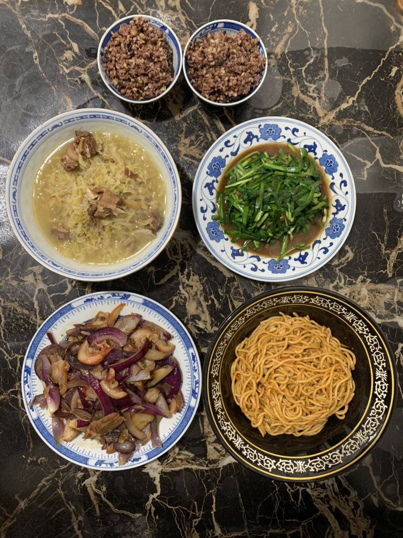 一桌开胃菜围着两碗杂粮饭