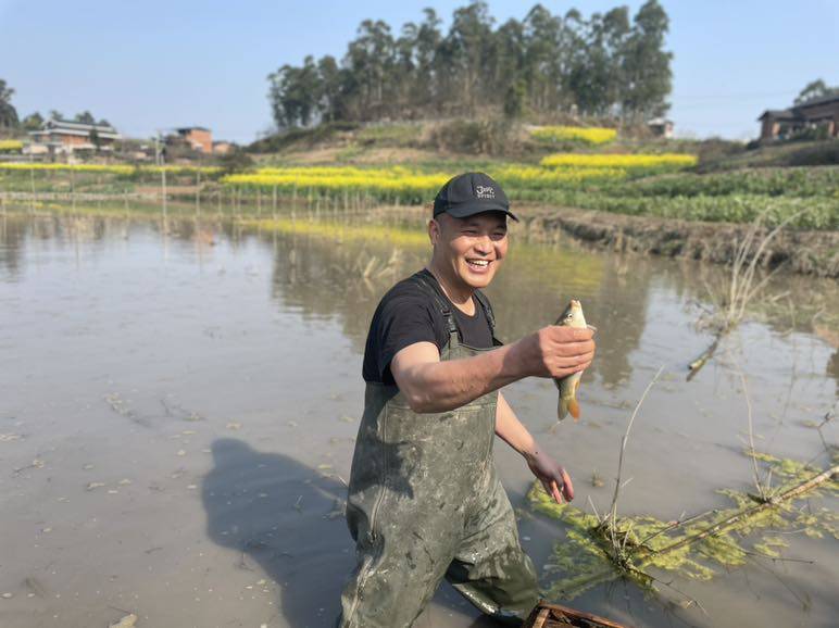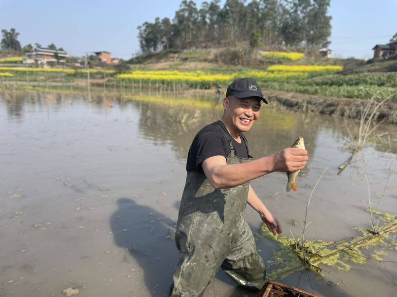 再到战友家,他们已经收获了几条鱼儿,我老公也穿上防水裤下田去捉鱼,无奈他跟不上鱼儿跑的节奏,次次都落空。最后还是拿着战友捕获的鱼摆拍了一张,抓住了丰收后喜悦的笑容。看着照片想想我们多久没有这样笑过了?愿这样的笑容多一些再多一些。