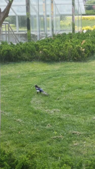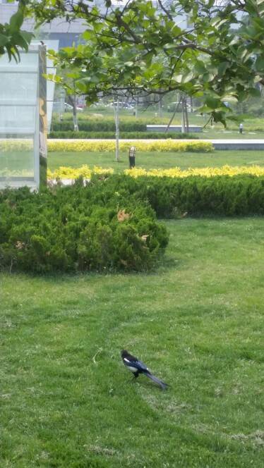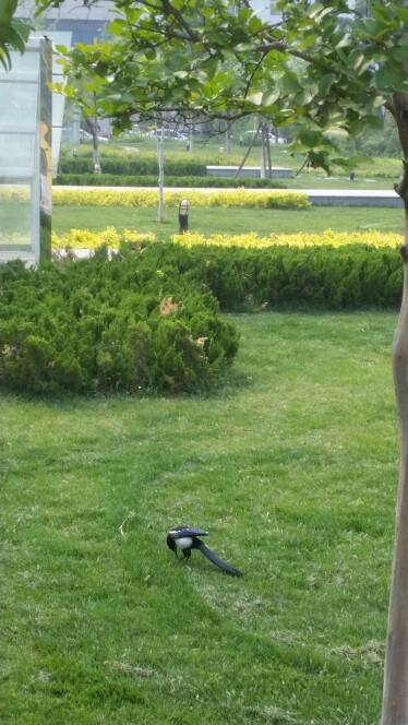 今天下午去看电影了,在路上看到的,不知道是什么鸟?是喜鹊吗?