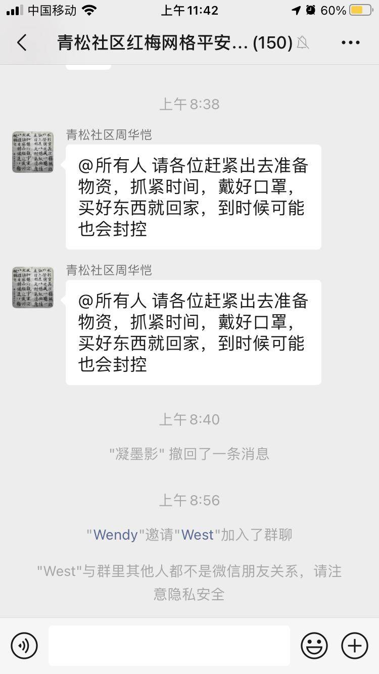 早上发现社区群发的消息,通知不要出门,没当回事