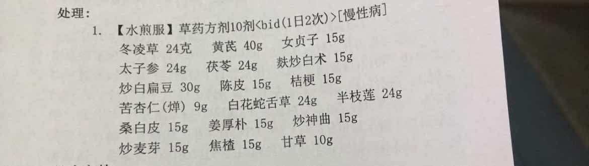 说喝中药调理的不错 我们也去了 这是医生给开的药方 妈妈喝了今天第6天了 觉得精神还不错 身体也有劲 胃口也很好