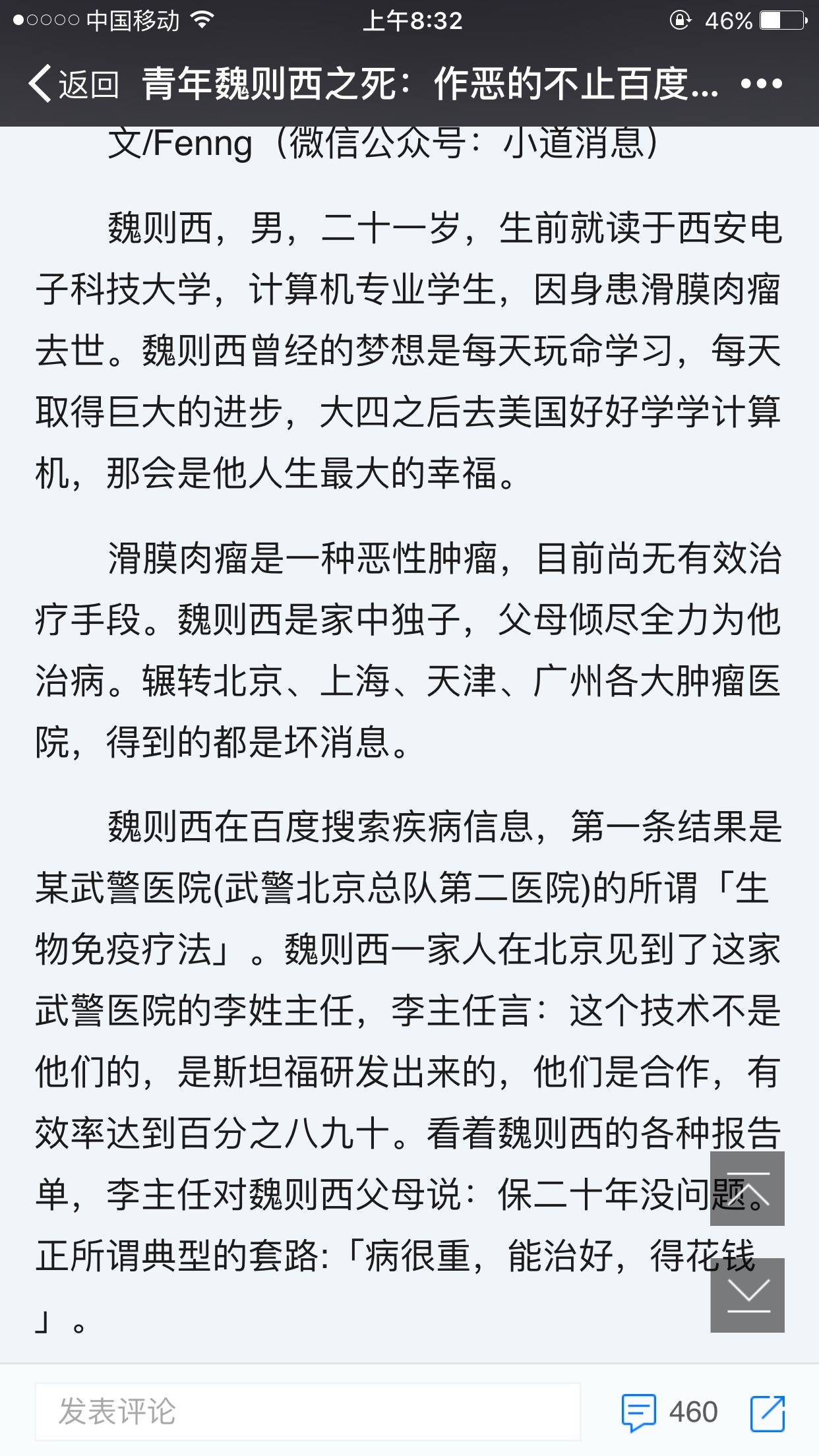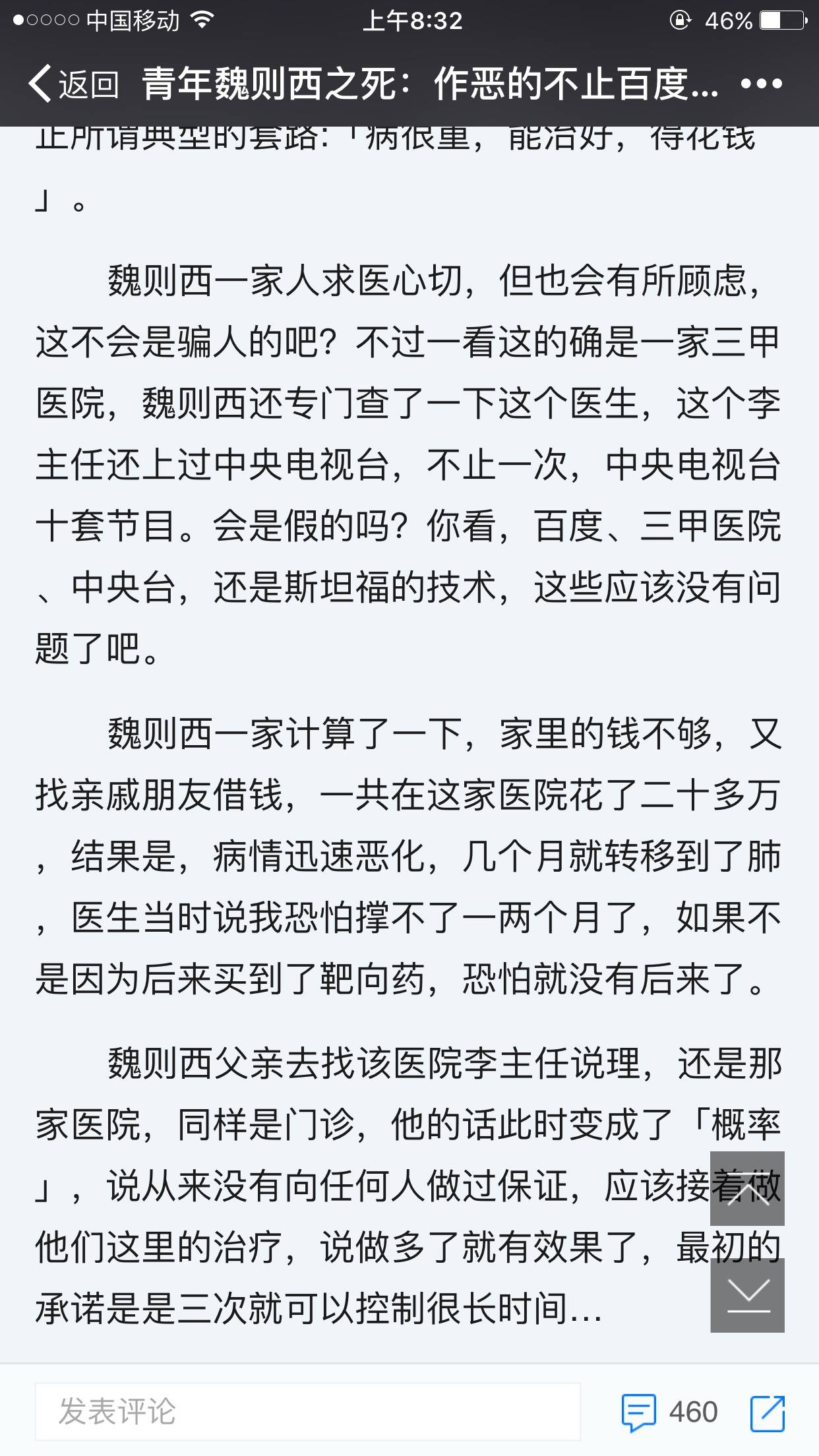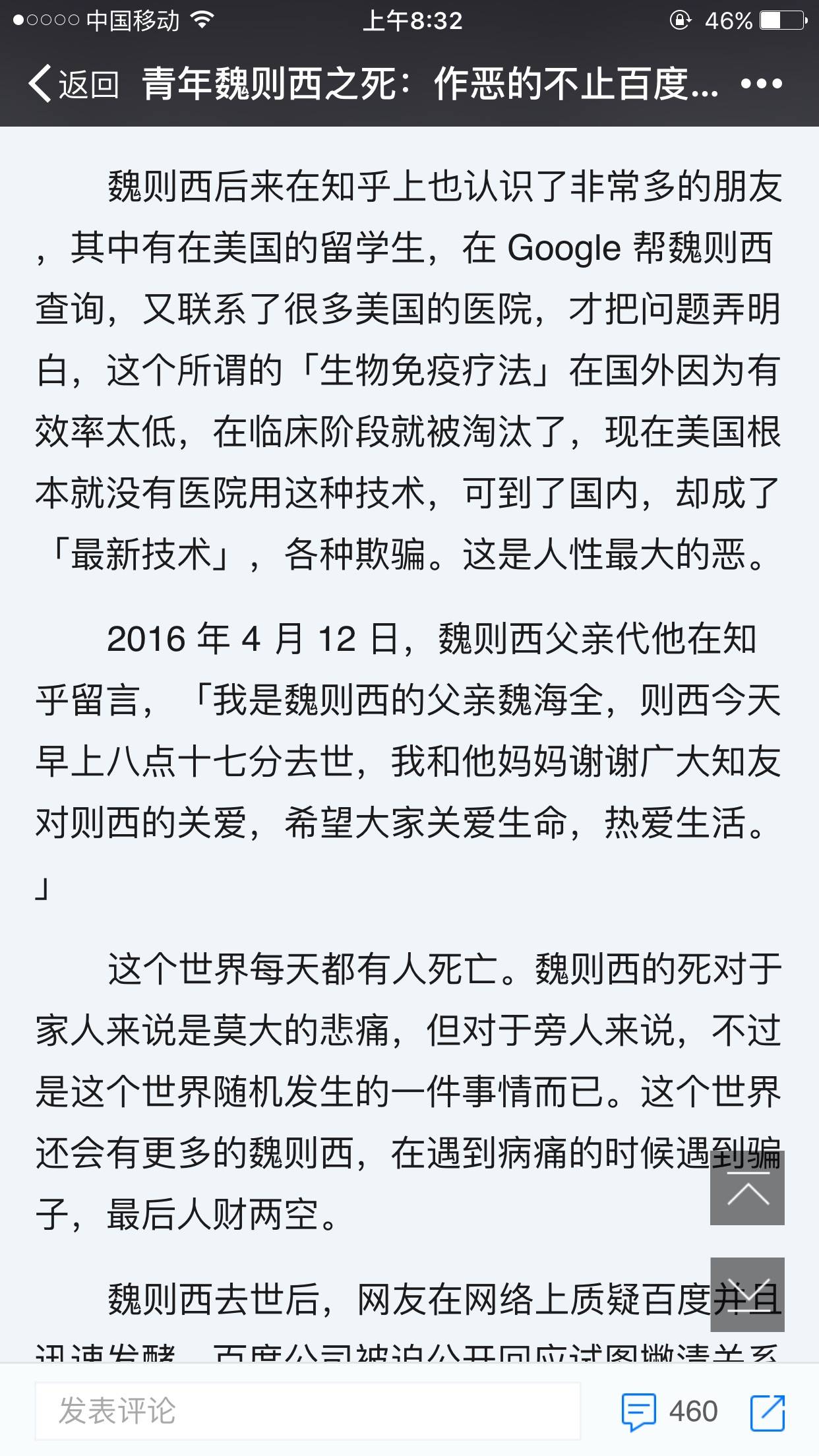 最近的新闻魏泽西之死把百度推向了浪尖,也引发了很多感想,作为患者及患者家属在家人生病时往往信任百度,想从百度上多得一些信息,(患病信息,治疗信息),在治疗中患者如无改善又会想盲目地再去试另一种方法,结果就这样被无良的莆田系医院坑了,到最后人也没了,钱也欠了一大堆。 我想说多百度是对的,至少我们对这病会有认知,但需要多百度,自己多判断,多问问同样的病友,至少他们不会骗你,他们是用自己的经历与你分享。 这次的魏泽西之死也辐射了一个免疫疗法。是魏则西在美国的留学生朋友,在 Google 帮魏则西查询,又联系了很多美国的医院,才把问题弄明白,这个所谓的「生物免疫疗法」在国外因为有效率太低,在临床阶段就被淘汰了,现在美国根本就没有医院用这种技术,可到了国内,却成了「最新技术」,各种欺骗。而做为患者家属我也曾经寄托这样的技术,希望爸爸能多活几年,后来爸爸的主治医生有说这个技术并不是想象中的那么有用,还是先用现有的一些方法治疗,我们尊重医生的判断跟看法,现在爸爸化疗了三个疗程还是有控制的,还是不错的。 最后还是重复那个看法,作为患者的我们一定要多注意,多查,多问。