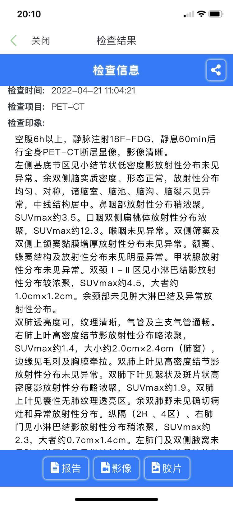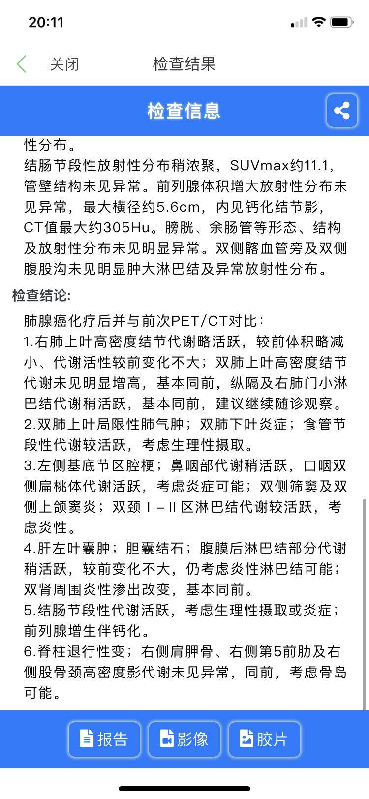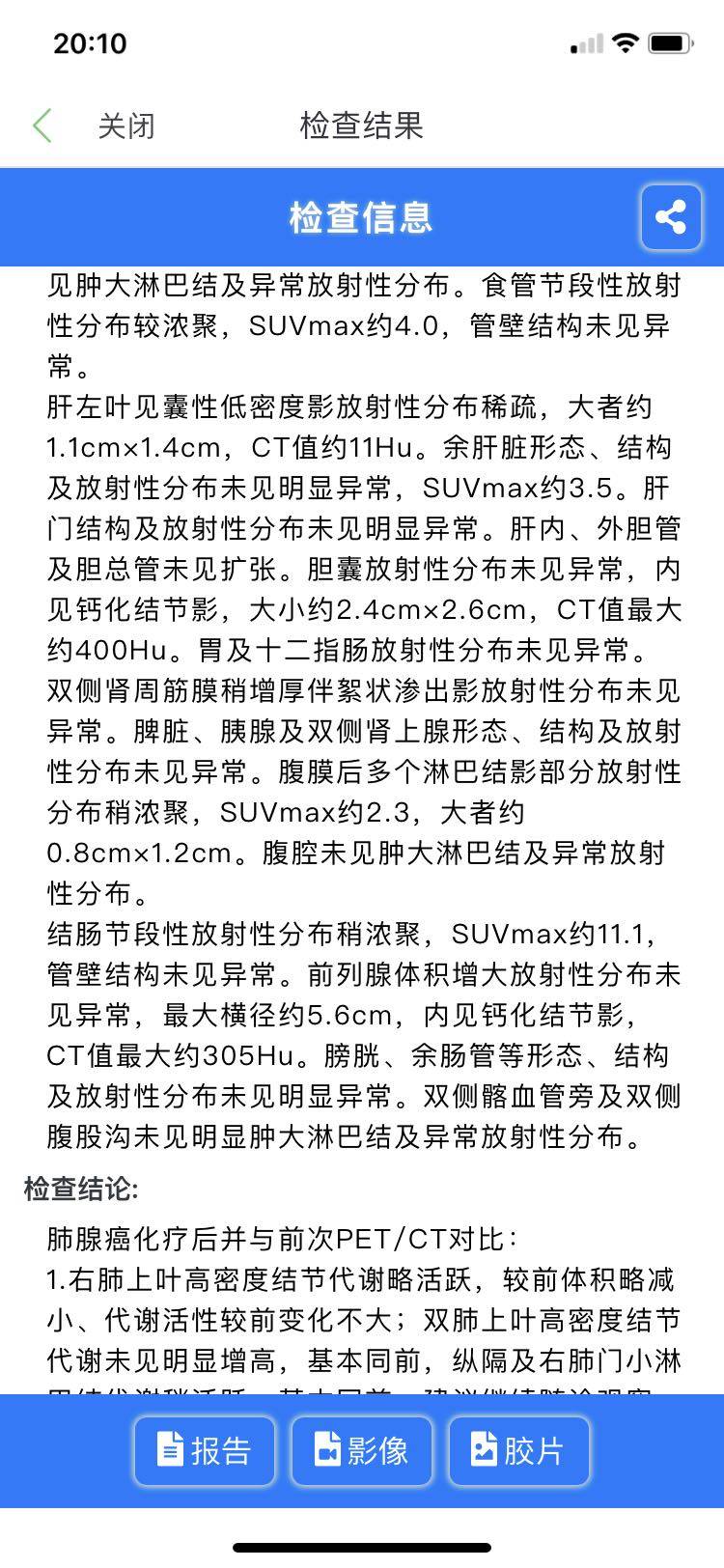 2021年四月份拍了CT我之前帖子上也有放可以说效果非常好,几乎就是没有活性。处于无瘤状态。结果2021年九月份我爸发烧,胃痛。短短一周的时间体重竟然减轻了10斤。我当时就有一种不祥的预感,果断去医院进行增强Ct全面检查。CT显示肺部出现一大块不明阴影,我们主治大夫又找了呼吸科大夫一通看片子推断可能是肺炎,停药消炎。转入呼吸科消炎半个月左右,复查CT阴影减少确定是肺炎。继续培美➕贝伐。转眼就到了,2022年的十月份,经我和主治大夫沟通,决定这次复查我们直接做派特CT。复查结果出来了,怎么说呢?继续无瘤状态几乎没有活性。感觉癌细胞在我爸体内已经罢工 了 ! 已经偃旗息鼓了。已经不战而溃了!
