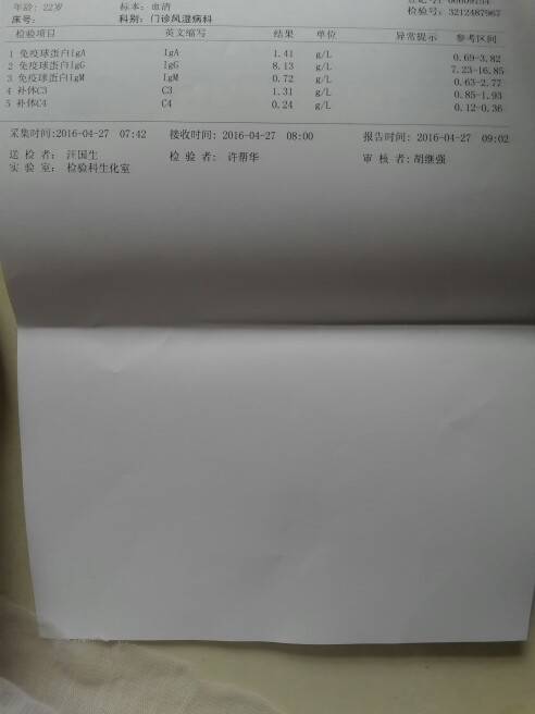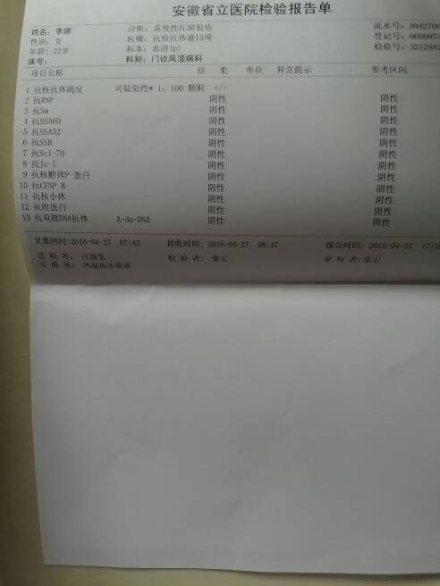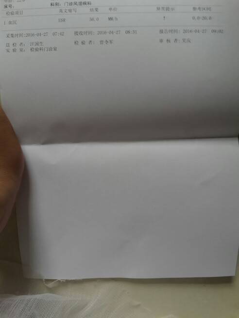 快生了,在生之前最后一次去免疫科报道,上个星期把该做的抗体啊,补体啊都查了一遍,顺便问问产后需要吃多大的药量,今天去拿化验单,奇了怪了,之前一直正常的血沉这次突然升高了,其他的正常,主任给我量了血压,好的,主任说,结果正常来说还不错,让我还维持现在的药量,到产后一个月在去复查