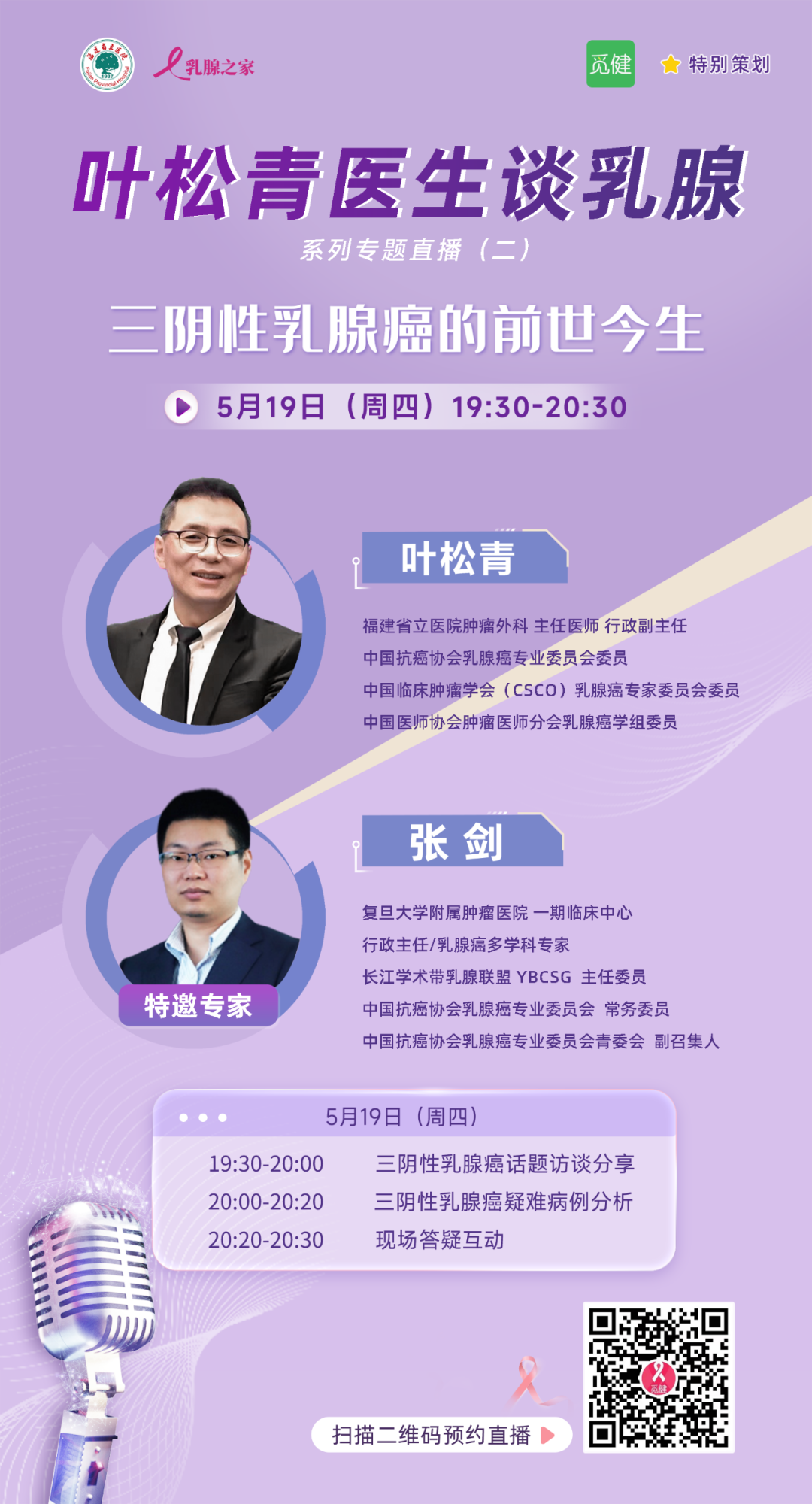 5月19日(周四)晚19:30-20:30,叶松青教授将与张剑教授一起,分享三阴性乳腺癌的前世今生,探讨三阴性乳腺癌的共性问题,届时张剑教授将与我们分享复旦大学附属肿瘤医院的三阴性乳腺癌治疗策略,了解最新的临床诊疗方案。