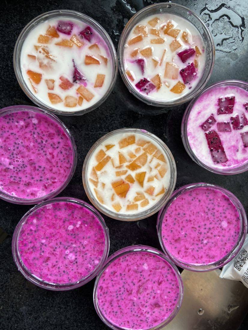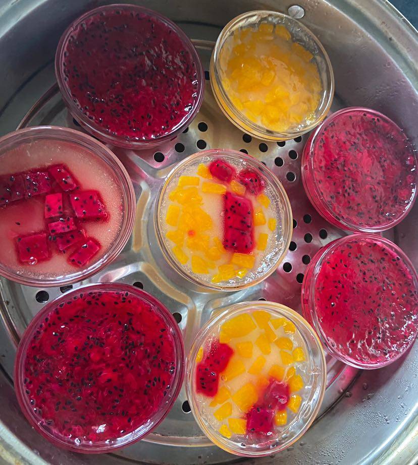 最近成都都在下雨。也就没怎么出门。去年还是前年成都允许摆摊的时候 我就买了砵仔糕粉。准备去摆摊。然后买回来就扔那里了 最近拿出来试一试 还不错哟。第一天简单做了一下 今天用火龙果调粉做了点彩色的。