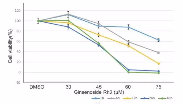 有研究[7]检测了人参皂苷Rh2对宫颈癌HeLa细胞增殖的抑制作用,将HeTa细胞接种于6孔板中,过夜孵育,然后用不同浓度的Rh2处理细胞,发现当Rh2浓度为72μM,作用时间为1个小时,可以显著抑制细胞增殖。