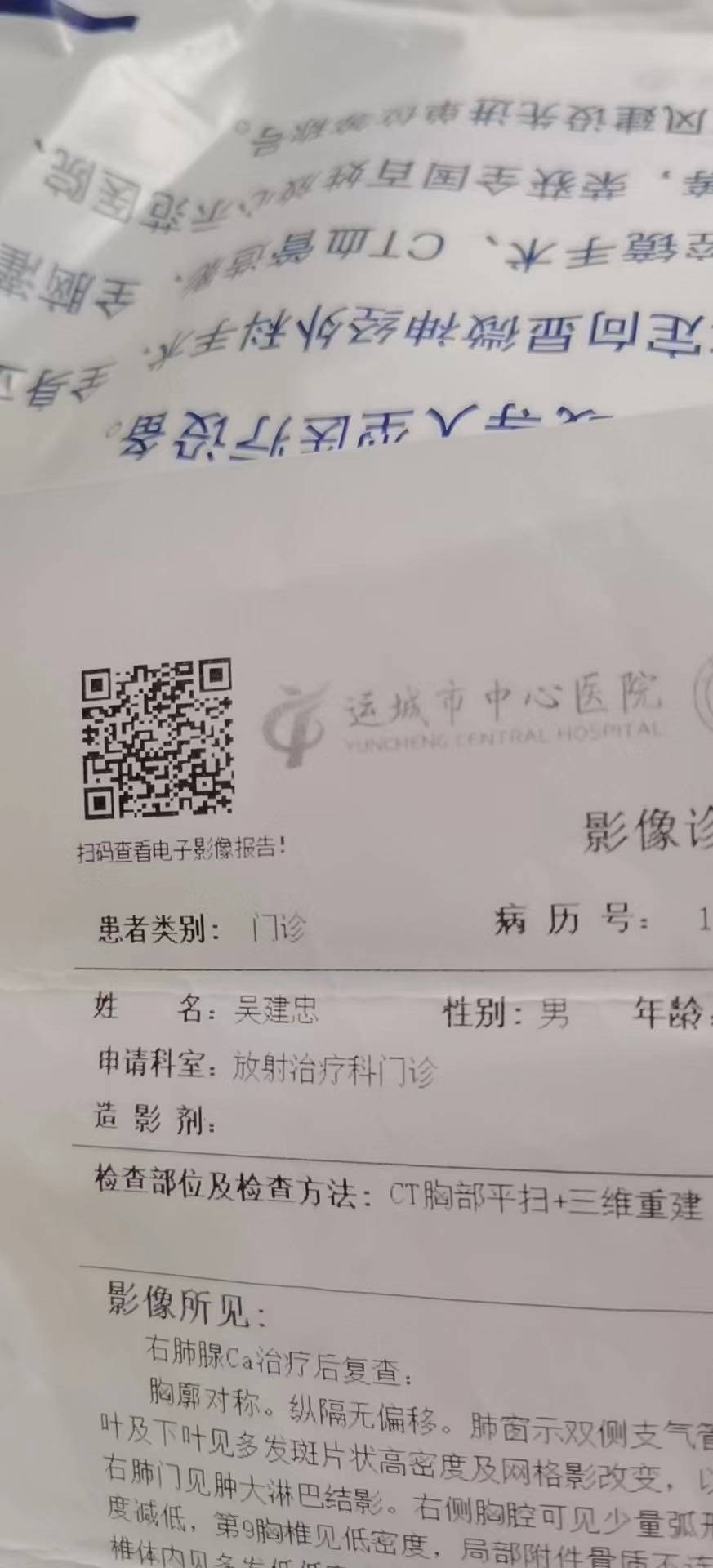 补全一下化验单子,ct报告需要扫码,里面有一个检查记录看。3月12号确诊的肺腺癌多处骨转移,肺栓塞。用过奥西替尼靶向药1片,肺肿瘤,淋巴病灶较前缩小,但肺栓塞有增加。此外用过利伐沙班溶栓,止疼药盐酸氢考酮缓释片,吗啡片。放疗过一次是针对病理性胸椎6,9,10骨折止疼。当时指标正常。回到家两周牙龈少量出血,肩胛骨疼再次住院。因为血小板计数42,用Tpo,海曲泊帕提升血小板,但效果不佳反而降到18,后输了两次血小板,两天前化验52,现除了止疼药其它药都停了。