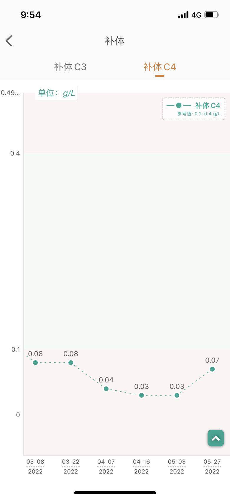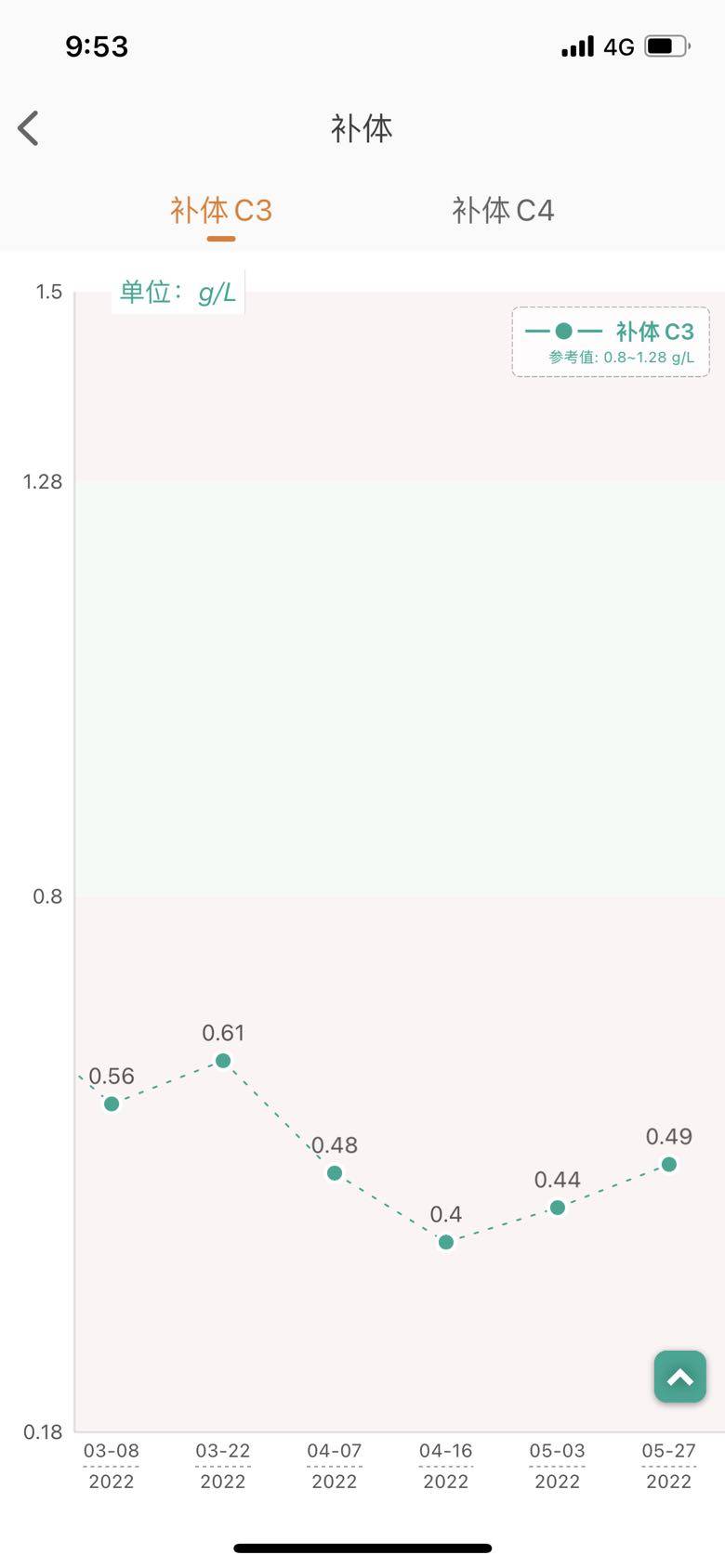 终于熬到一个多月了,内心充满期待和煎熬,今天结果出来了,在没有其他药改变的情况下,加用泰爱1支,补体都在缓慢升,心里很激动很激动,喜极而泣,就是血沉突然高了起来,24,高了一点,白细胞还是老样子低,又下降了些……总体感觉还是不错