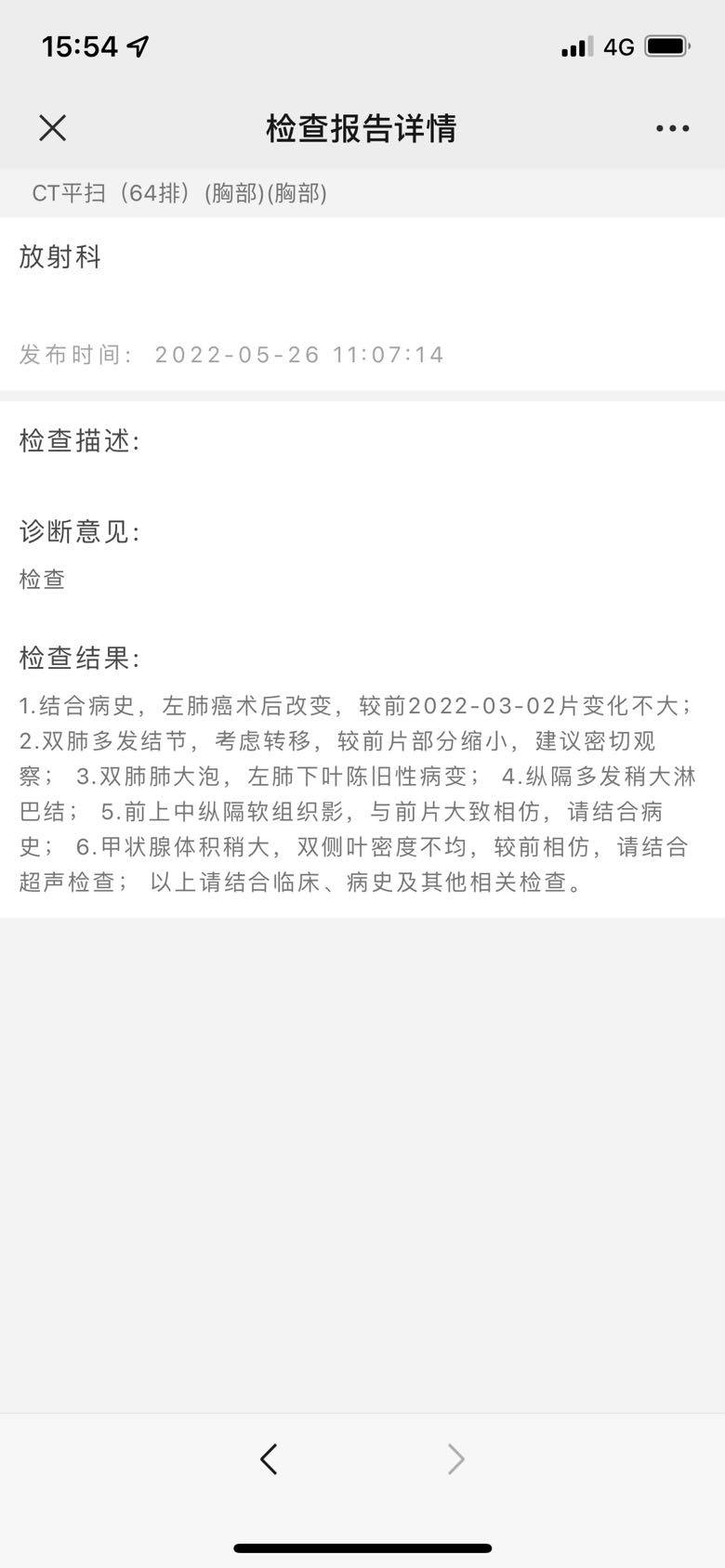 本来应该满一个月复查,但是近期体感真的不好,胸闷气短咳嗽失眠,吃药后胸闷气短状况并没有改善,内心一直担心是不是奥西替尼没有效果,天天胡思乱想干脆提前去拍个ct,结果居然效果还不错,医生说多发的小结节好几个都没了,心里还挺高兴的,但是,这个体感并不咋样呀,医生让继续吃药,那就继续吧